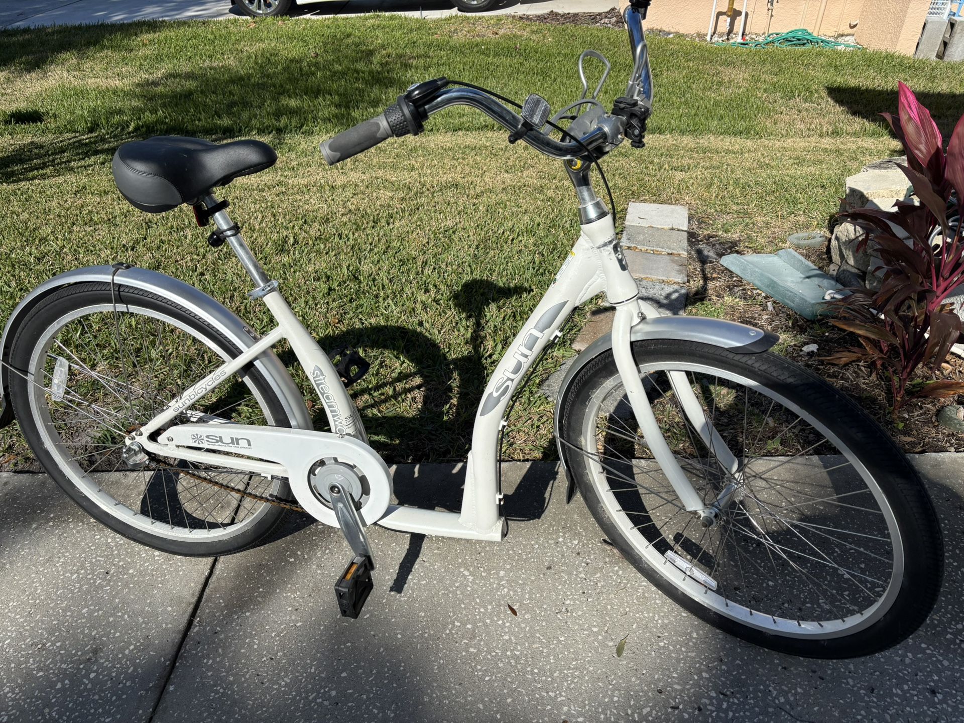 White Sun Streamway step-in bicycle. 16 inch frame with 3 speeds. Great for cruising the trails or the beach! Good condition. Comes with a basket, cell phone holder, bell and a bottle holder. A new bike like this is @ $650.