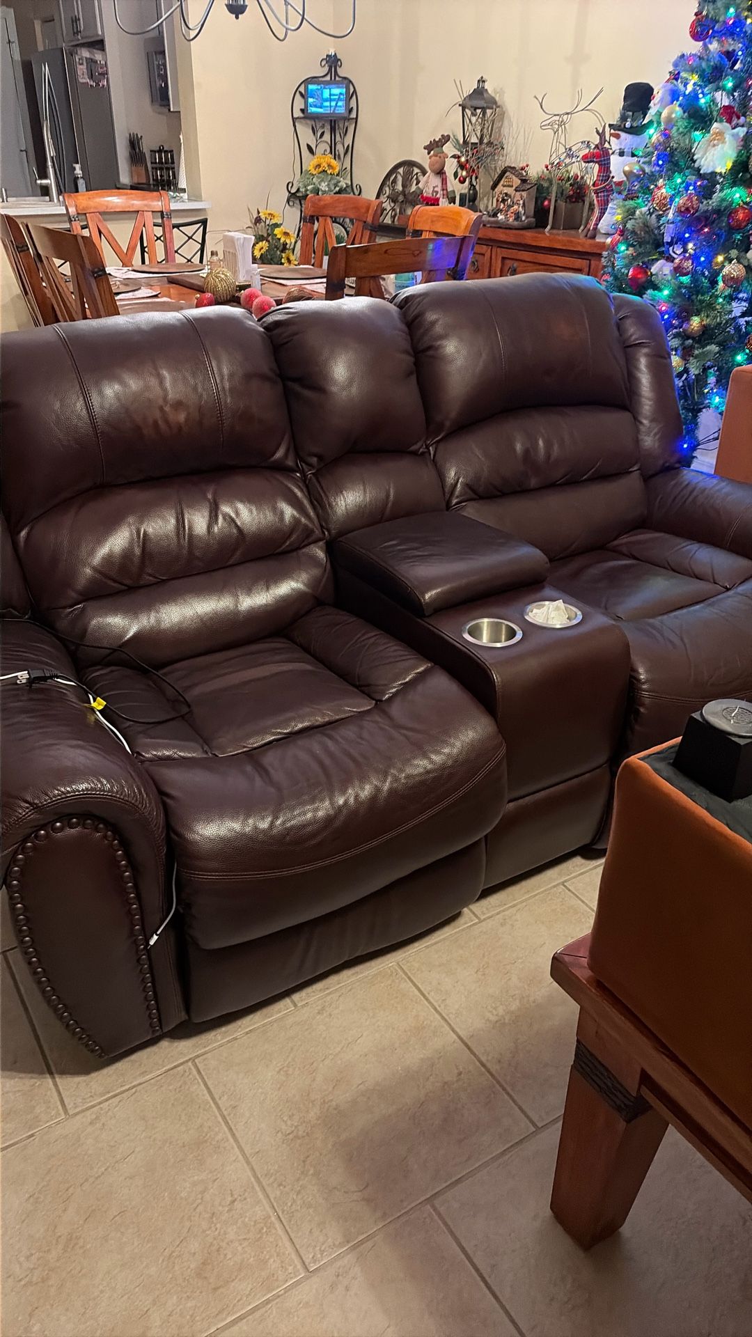 Dark brown leather couches 2 seater and both ends on 3 seater are reclinable. Both couches also have charging ports on both sides. There is wear and tear with some scratches and fading near the headrests of 2 seater.