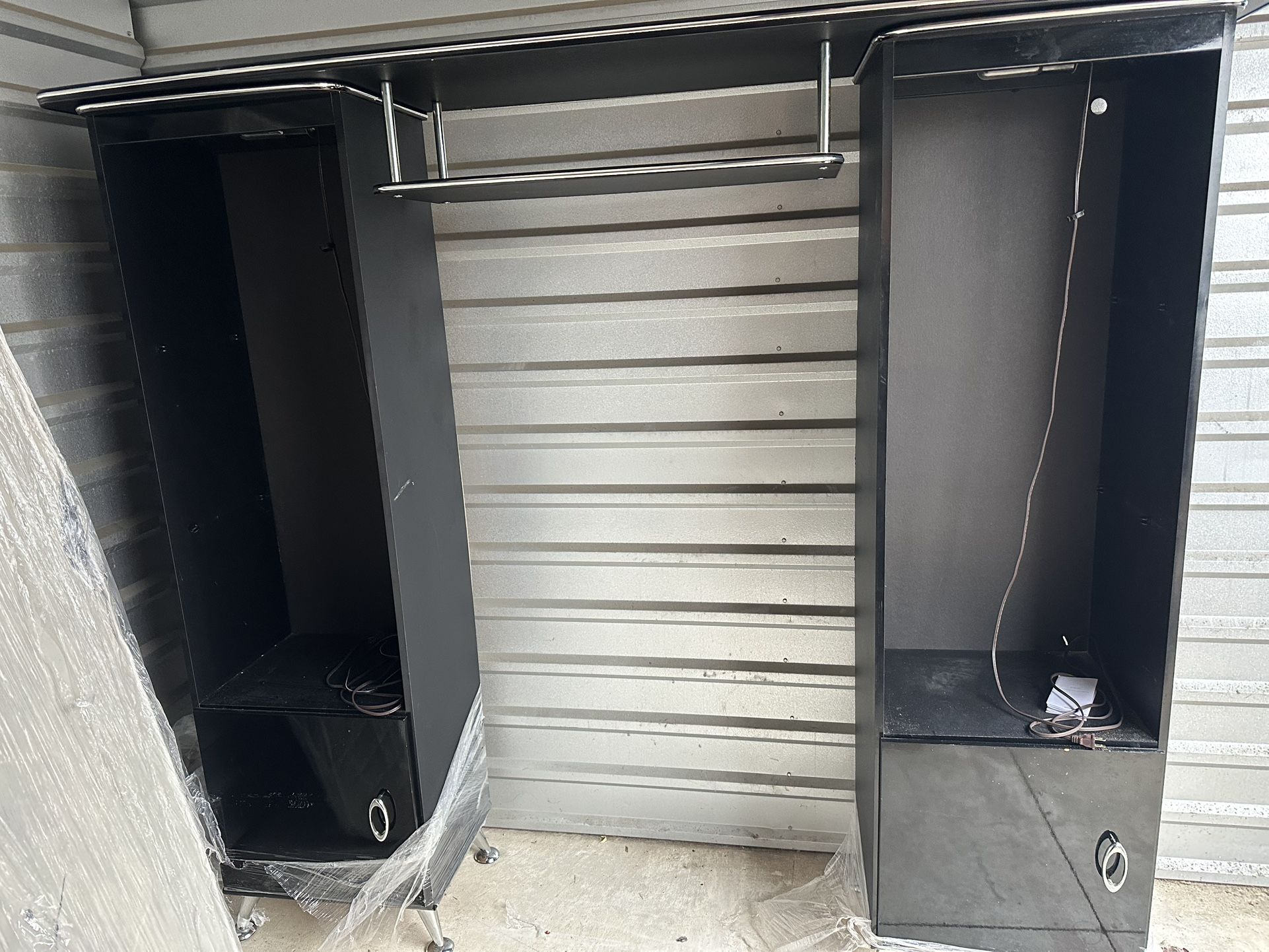 Polished black wall unit with 2 curio shelved sections. Lots of space for pictures, decorations, and disc players. An extended overhanging table on top, with light bulbs. Enough space in between to contain any size Tv or wall unit, it has glass shelves.