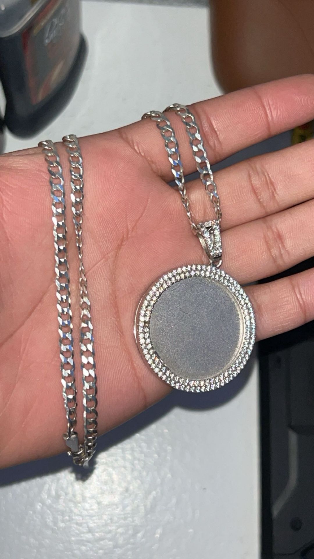 VVS Moissanite custom Photo Pendant (30mm) Real 925 solid silver Missing one diamond CHAIN IN PHOTO NOT INCLUDED Send offers Check out my account for more