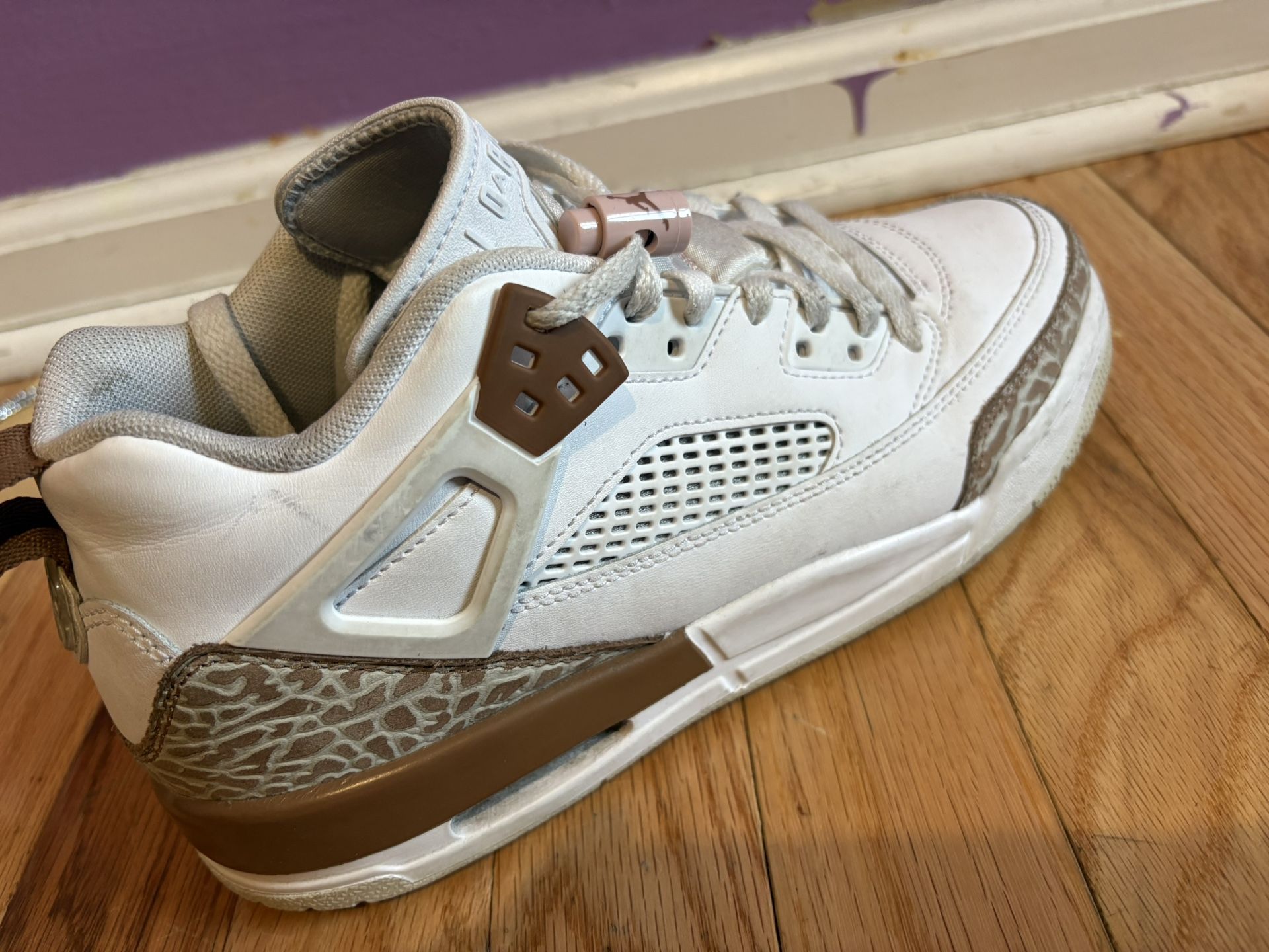 : Jordan Spikes Low “Archaeo Brown” in size 7Y. Pre-owned with normal signs of wear including creasing and some sole wear, but still in wearable condition. Clean white base with brown/animal-inspired print accents. Good everyday sneaker