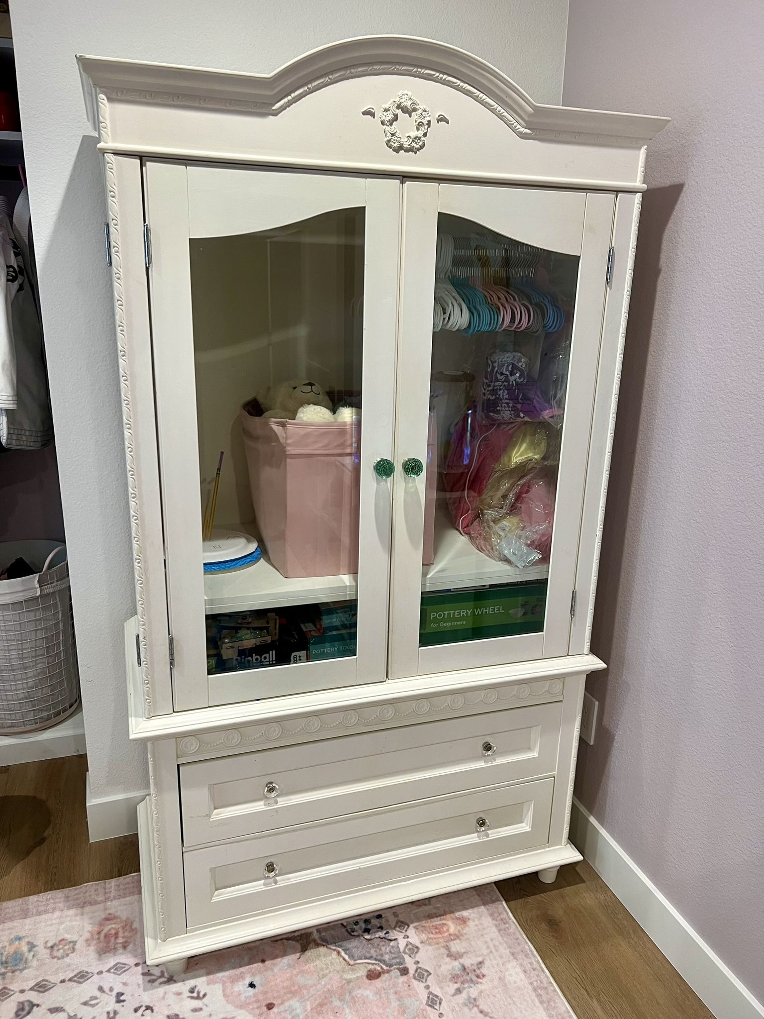 Children’s White Armoire/Wardrobe. Some wear but overall in good condition. The bottom drawer does not slide on the track. properly. Has been used for costume/dress-up clothes, doll clothes, etc. Heavy piece of furniture- will likely take 2 people and a truck to move. 69 2/4” H x 39 1/2” W x 20” D