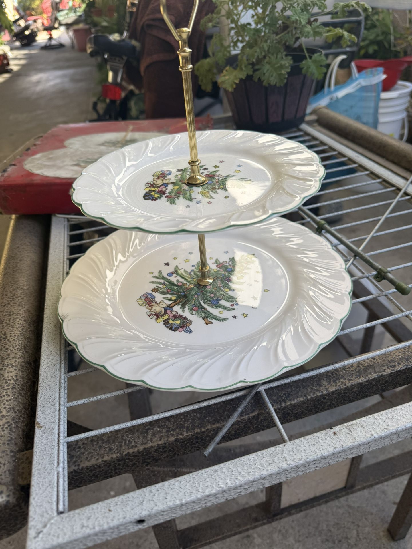 Nikko Happy Holidays (or Christmastime pattern) two-tier serving tray with a brass-colored handle.