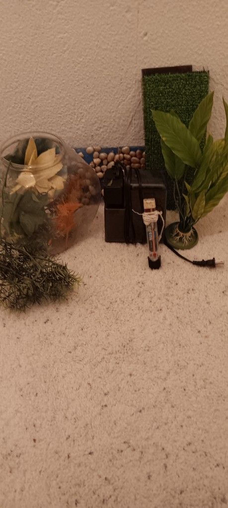 Holiday special for a 4 sided fish bowl. Measures 7 inches W. X 8 1/2 inchescT with a 4 inch opening. 100% Acrylic latex. The vintage power filter & thermostat ate part of the kit. The filter stands on the botyom with an interndal sponge. The filter measures 41/2 inches W x 4 1/2 inches T.The foliage can be used in the bowl or tank. A nice gift idea for kids who want a new hobby. Will sell fish bowl & air filter separately ^ with the purchase of the fish bowl; the thermostat is $2. Fish Bowl $6.