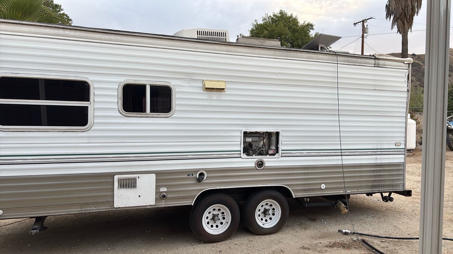Have title in hand, comes with the generator in the pictures. The generator is 900 brand new in the box. The electric and gas would work but i dont have the tank for the gas. Not willing to do trades. Its about 20 by 8 feet.