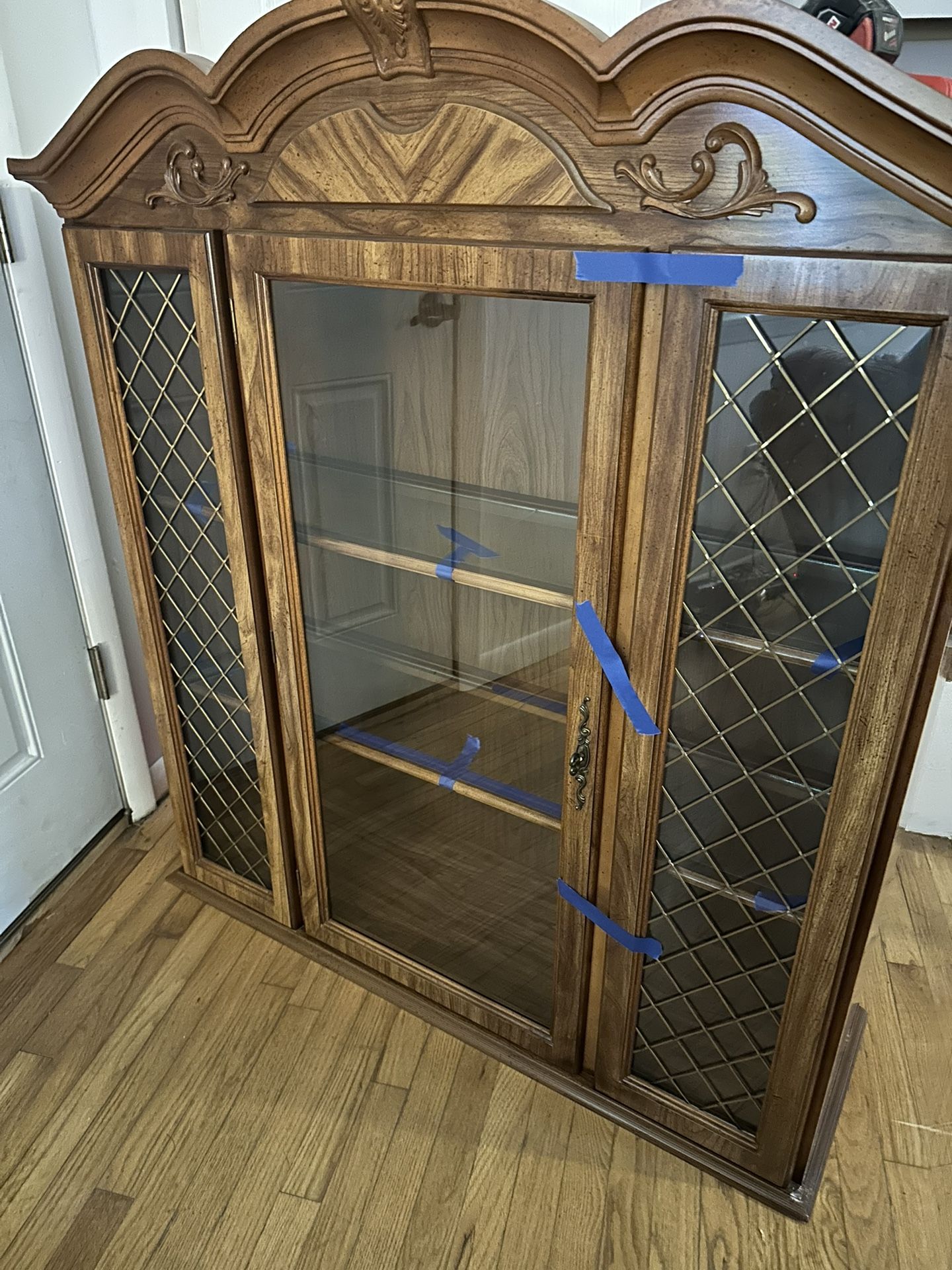 Glass cabinet Can be hung on wall or put on a stand In perfect condition Great quality All glass is intact and no pieces missing
