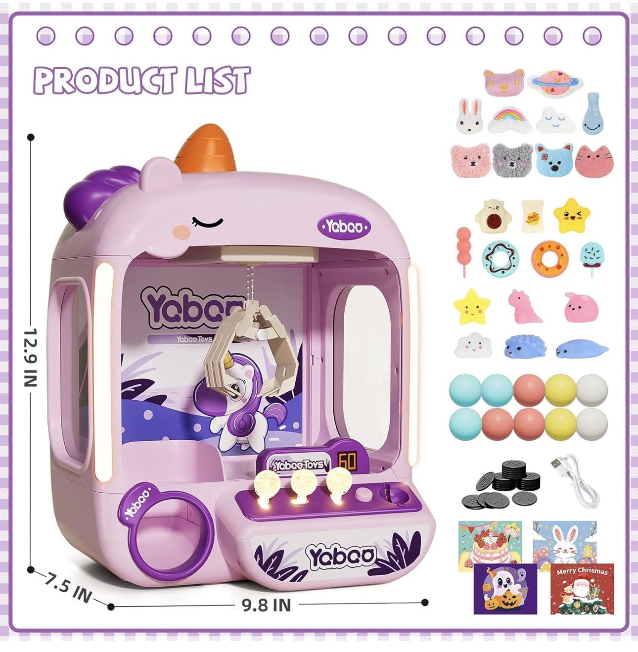Box damaged $10 Coin-operated Claw Machine for Kids: This kids claw machine is coin-operated (with 24 coins), just like a real-life arcade claw machine. While playing, kids will get an idea that everything is no-free, from coins to chances, from claw games to mini prizes. At the same time, to build confidence through challenge, the mini claw machine for kids has a sensitive and strong claw, that can be easily moved 360° by operating three crystal joysticks. Once a mini prize is grabbed, it won't drop easily until your little one lets go 60s Countdown/Interactive Cheering/Lights & Music: More functions of this toy claw machine for kids to meet an immersive arcade game atmosphere, ensure hours of family fun. Besides the light and music, 60s countdown makes friendly arcade claw competition more exciting. Interactive cheering by infrared sensor will let the happiness of the prizing moment double added Rich of Mini Prizes, Easy for Toys Refill: The big claw machine for kids has a door behind and a large space, size 7.48*9.84*12.99 in, which can be easily filled with mini toys inside. Comes with more than 60pcs of small toy accessories, 10 cute plush fidgets,10 twisted eggs and many surprise mini toys inside, like candy, squeezable toys, unicorns, dinosaurs and rabbits. Kids can also add other mini prizes, party favors, slips, dolls, candy or snacks as they like. Let the kids claw machine work as a candy machine dispenser at a party or an egg grabber for Easter, is a great idea for girls Interactive Arcade Game Machine for Kids: The kids claw machine with toys inside is also an electronic educational interactive toy. Not only do kids learn sharing, swapping, and taking turns social skills while playing the mini vending machine that promotes friendship and parent-child relationships. Moreover, operating the joystick of this toy vending machine also develop their hand-eye coordination, logical thinking, orientation and spatial sense. Meanwhile, it's a game of challenge and surprise. As the girls or boys grab the mini prizes or candies, a confident smile blooms High-quality Materials & Cute Shape: Our electronic arcade claw machine for kids, made of durable ABS plastic, smooth contours, that for a safe playing experience. Bright color and cute shape design is also an eye-catcher for your little ones. No need to assemble, simply untie the claw, plug in a USB cable, and have fun with the toy claw machine for girls or boys! Take the joy outdoors - our mini arcade claw machine is a perfect addition to any carnival party or backyard bash. Just power it up with 4 batteries (not included), and watch the kids' excitement unfold around the mini claw machine 5 Types of Party Themed Backgrounds: Unwrap a world of joy with our toy claw machine - the surprise gift that will have kids screaming with delight. Designed to fit seamlessly into any themed holiday party, this small claw machine for home comes with 5 themed background cards, perfect for Christmas, Easter, Halloween, or birthday parties. If you're looking for a cute party toy gift for kids girls boys 3-5 6-8 8-12 and up, look at this kids claw machine, isn't just a toy - it's a party in a box