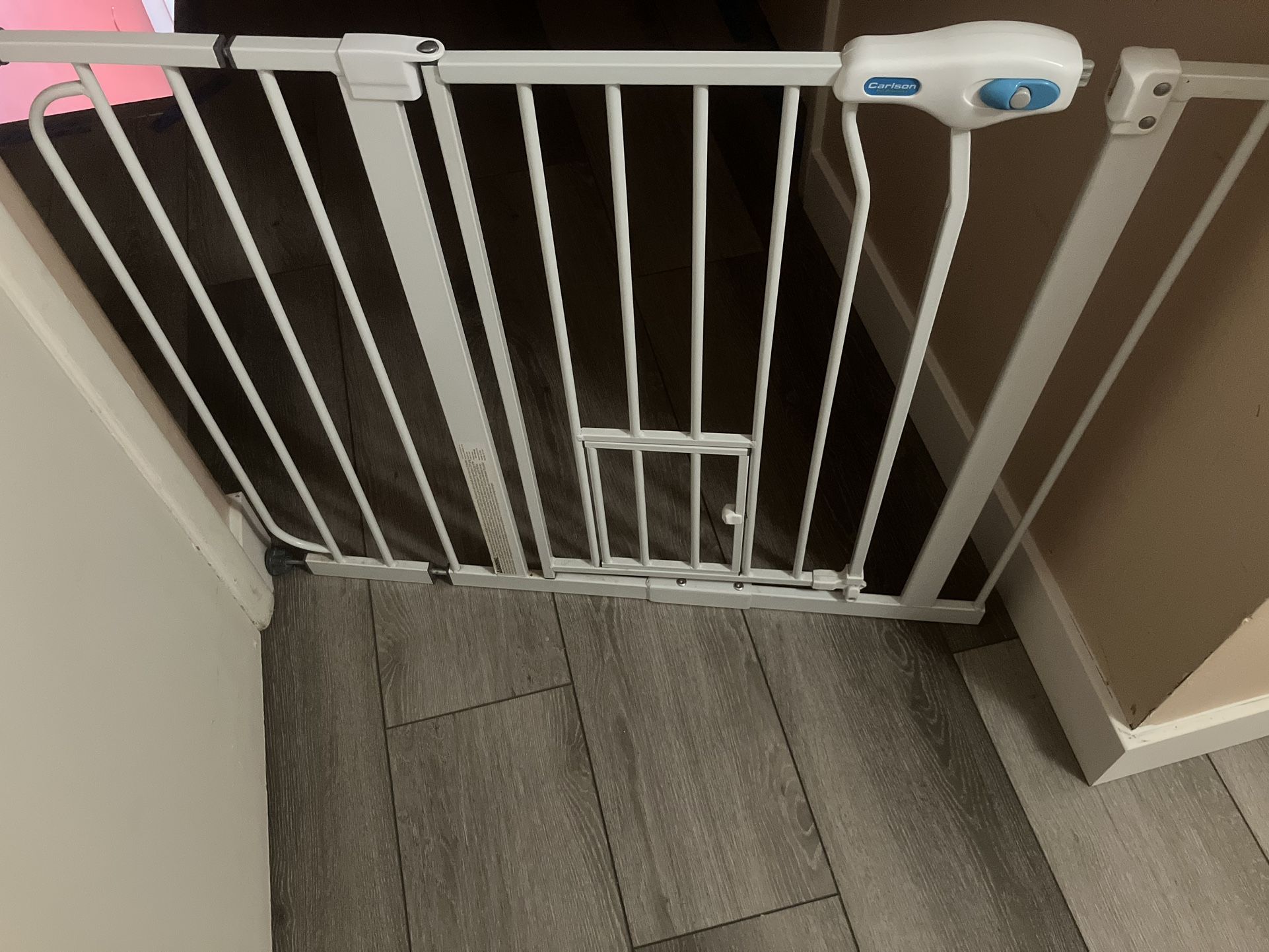 I have two of these gates both are 34 inches wide with both sides able to increase 4 inches with a total of 8 inches more in length if needed. One of them is 30.5 inches high and the other one I have is 36 inches high. They have all parts to secure it to a wall, easy to install. I’m only willing to sell them both at the same time for the deal of a lifetime as they look brand new still!