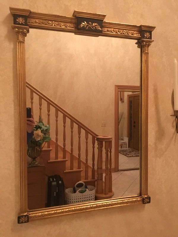 Gilt Gold Wall Mirror with Column Form Sides and Carved Tops. The mirror is 27 inches wide by 38 inches tall.