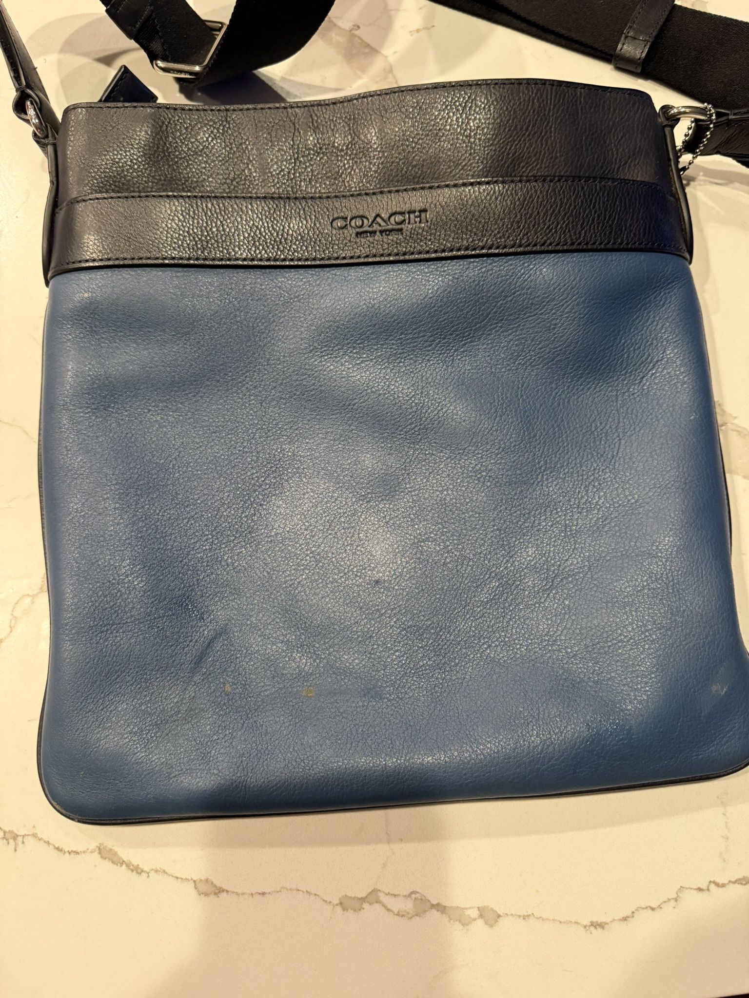 Blue and Black stylist leather tote bag. 10x22” with sturdy carrying strap.
