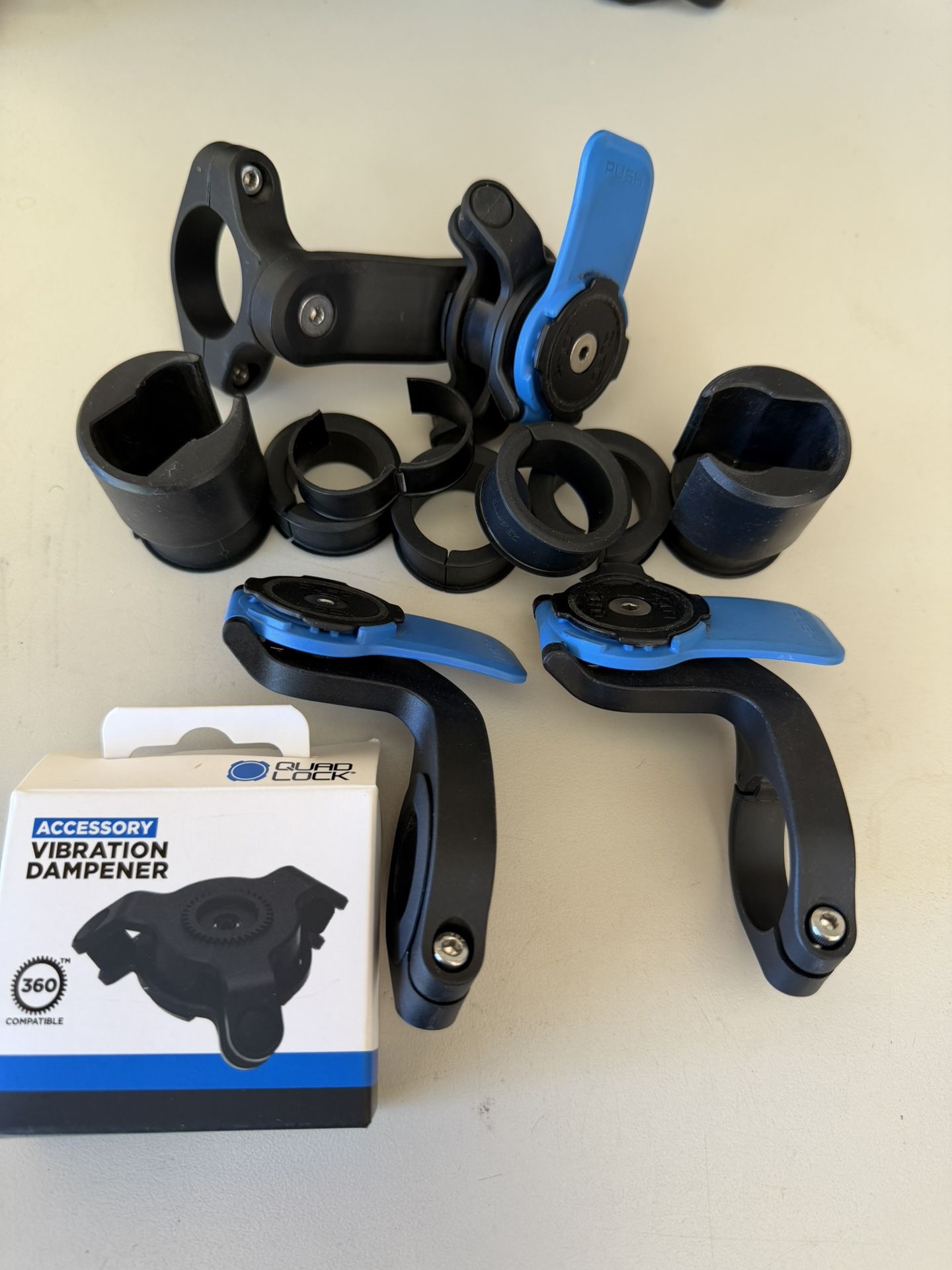 One is a motorcycle handlebar and two are bicycle handlebar attachments. Also two anti vibration holders. IF YOU USE THE QUAD LOCK PHONE CASE these are for you. Each piece sells normally for about $50. All for one price because I stopped riding.