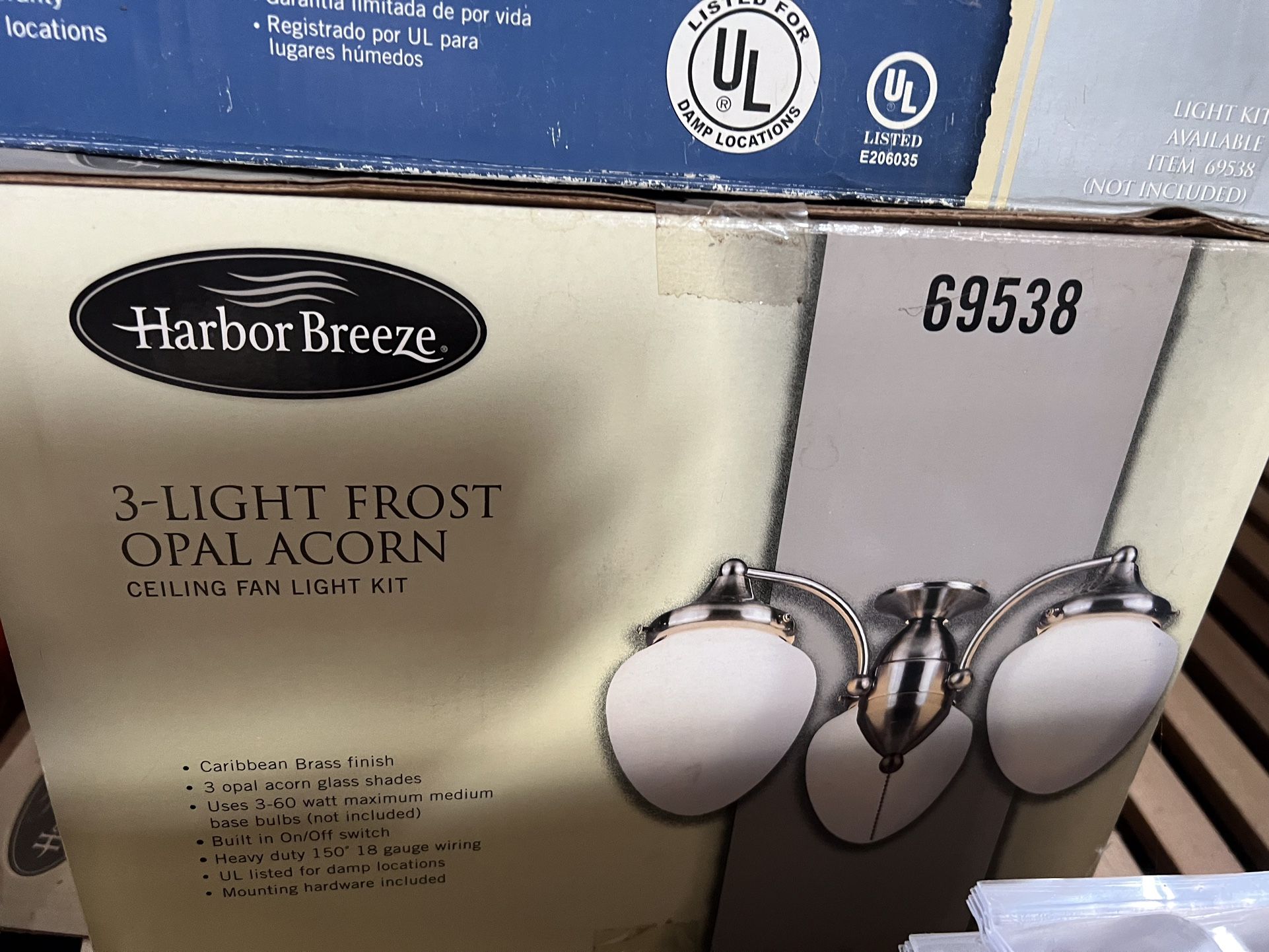 2 ceiling fans with light kits for sale price is per kit. Tropical look fan with acorn shaped light kit. New in box. Great for your outdoor patio or gazebo. Outdoor rated.