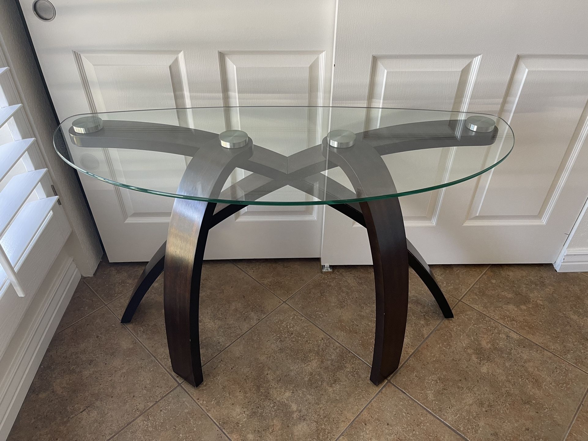 Glass with wood espresso colored legs. The dimensions are 45 length 27 height and 19 width