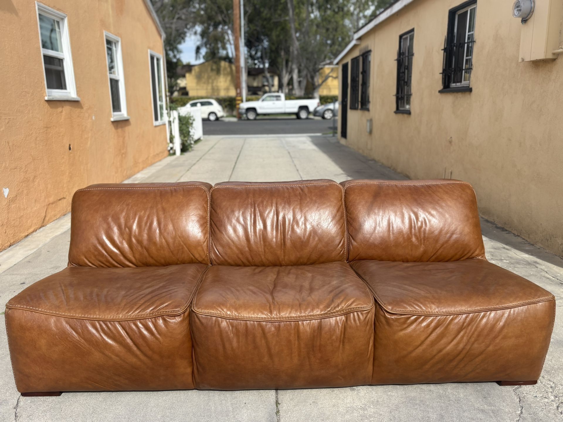 Retails for 1900$ from Living spaces Real high quality leather •excellent condition with normal wear and tear , couple scratches on the back of the sofa but not that noticeable as shown in the pictures and video •super comfortable and easy to clean 🧼 •pet/smoke free home •no major stains or damages •couch is 1 big piece does not separate •pick up for 800$ (easy access)or have it delivered for a fee •dimensions: 91"W x 42"D x 31"H