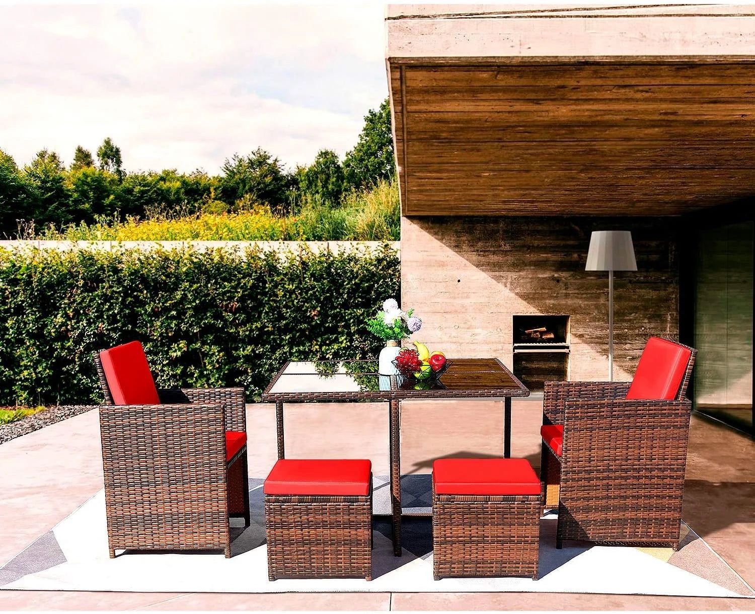 New 5 Pieces Patio Sets Outdoor Wicker Conversation Sets Rattan Chairs with Ottomans and Tempered Glass Table New in box LCRF2C2FRD, LCRF2T Sit down and enjoy your leisure time with this rattan furniture set from Vineego! This outdoor furniture set is made from all weather PE rattan, durable, beautiful and low maintenance.And the steel frame underneath the chair offers more support and stability. Two thick cushions filled with high-density foam plus soft pillow on each chair ensure you relax comfortably for hours on end, and can be cleaned with a simple wipe. The coffee table has a tough tempered glass top and is spacious enough. Our rattan furniture set is the perfect combination of style, comfort, and make you feel the beauty of life every day! Features: * 5 piece conversation set includes 2 armchairs, 2 ottomans, and 1 coffee table * High-quality steel frame wrapped with all-weather textured handmade rattan * Sturdy table stand and excellent tempered glass * Soft sponge cushioned deep seating for ultimate lounging comfort * Perfect for poolside, balcony, garden, decks, and other outdoor spaces * Lightweight design for easy carrying * All necessary assembly tools and instructions included