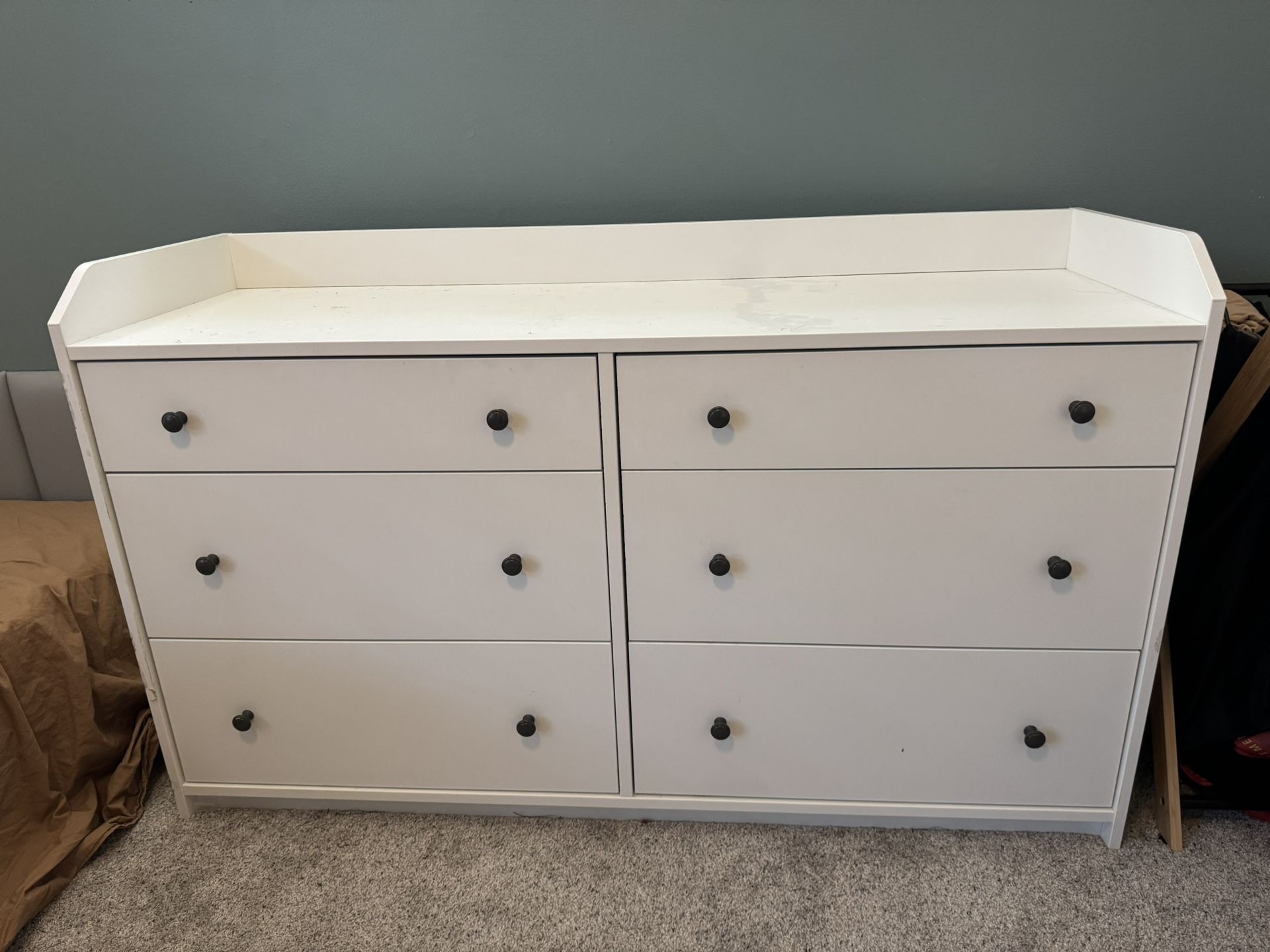 Used with discoloration on the top and on the corners, but still in good condition. All drawers still on the tracks.