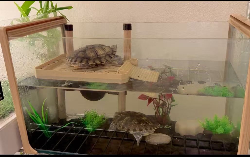 Okkobi glass turtle tank, comes with rock and mountain decorations (picture 4 and 5) And water fountain. UV B light included as well.