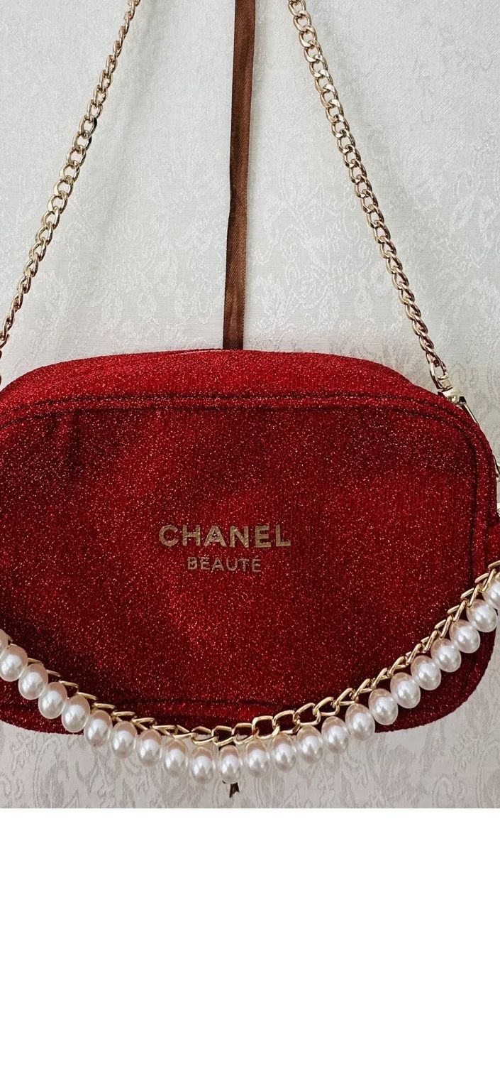 Beaute Sparkling RED Cosmetic/Makeup Case/Pouch converted into a Clutch, top handle bag or a Crossbody Bag. DESCRIPTION - Material: sparkling red tweed fabric, waterproof interior fabric - Dimensions: 8”x5.5”x2” - capacity: it fits an iPhone 16 Pro, wallet, lipstick, color palette, keys and other essentials (as shown in the last image) - straps: 1 pearl/gold chain combo for decoration as a clutch or as a top handle; 1 crossbody removable gold chain