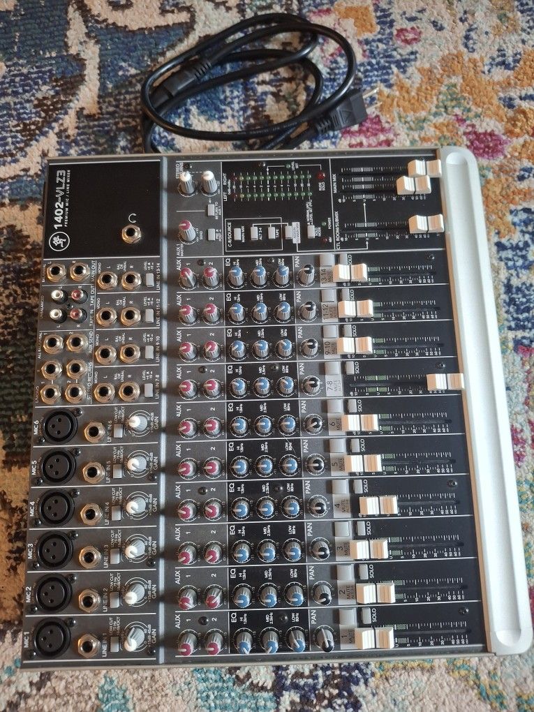 This mixer is commonly used for: Podcasting / voice work (when paired with an interface) Small live sound setups Home studios (especially with an external audio interface) Keyboard or drum sub-mixing Church or rehearsal spaces Model: Mackie 1402-VLZ3 Type: 14-channel compact analog mixer Manufacturer: Mackie Era: Mid-2000s (VLZ3 generation) Key characteristics 6 XDR2 microphone preamps (clean, low-noise, high headroom) 14 total inputs (mic + line) 3-band EQ with sweepable mids 2 aux sends + stereo returns ALT 3-4 bus (useful for submixing or recording) Metal chassis, sealed rotary pots (very durable) No USB / no digital interface (pure analog)