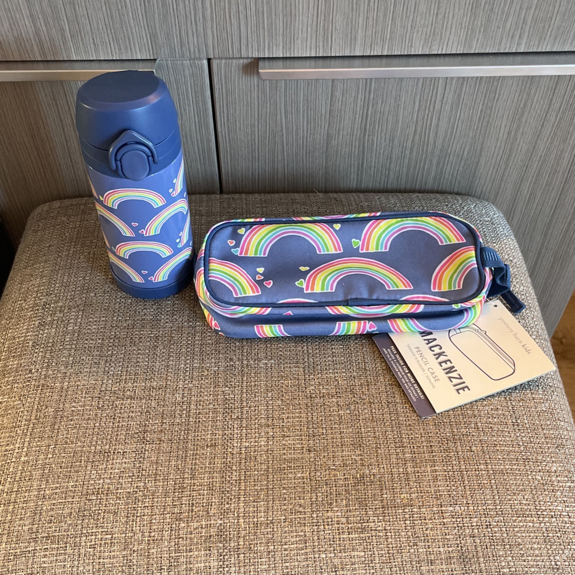 Brand new Pottery Barn Kids Blue colorful rainbow pattern Perfect for back to school Matching water bottle & pencil case Water bottle: 12 oz; Insulated bottle made with a stainless steel interior and polypropylene cap. Regular price $26.50 Pencil case: 8.5" wide x 1.75" deep x 3.5" high. Regular price $12.50 Asking for $20 for both Cash and local pick up only
