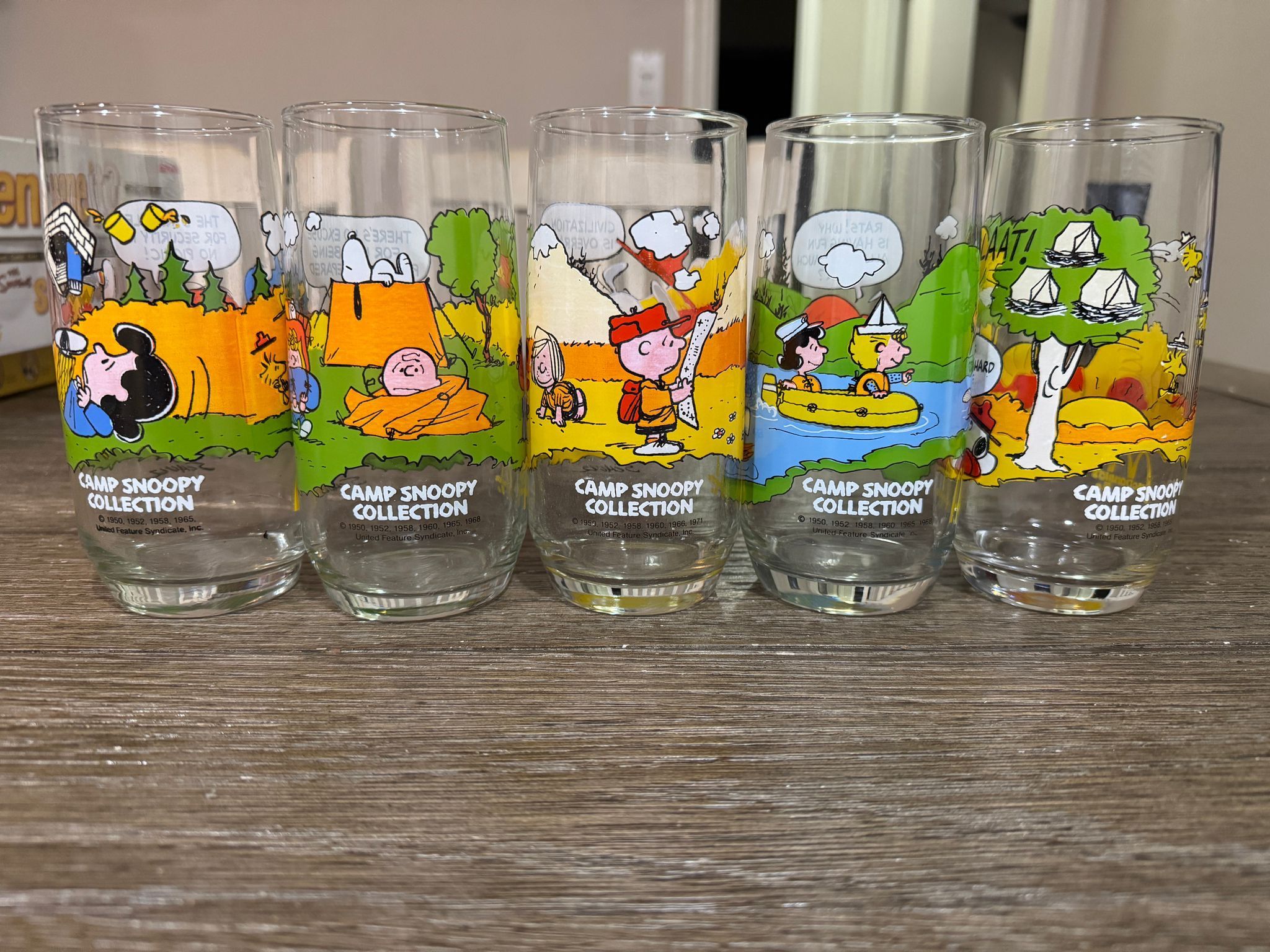 Vintage McDonald's Peanuts Camp Snoopy Glasses Set of 5 1965 Charles Schultz. $75 obo