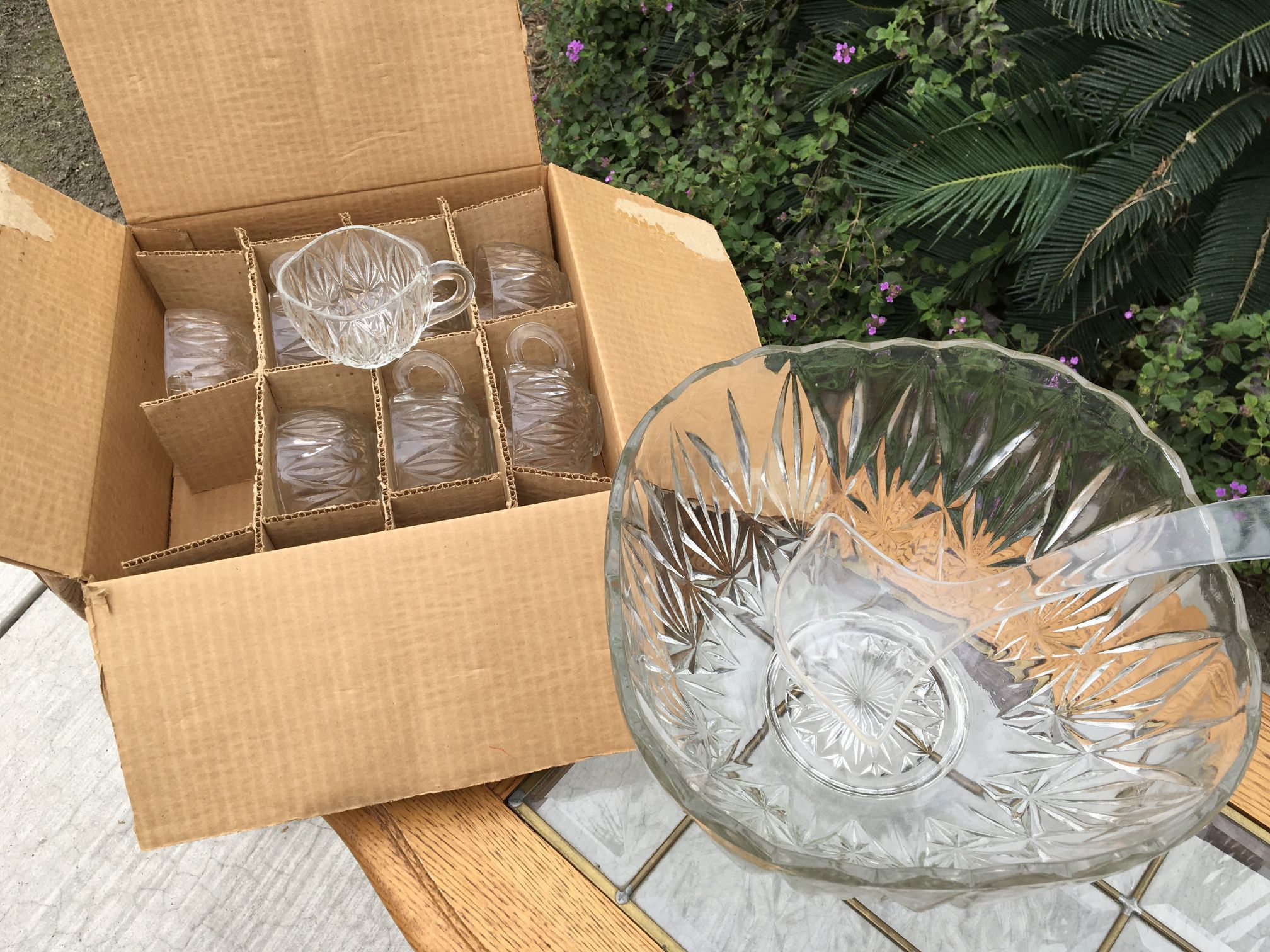 Vintage punch bowl with 12 cups, excellent condition. No chips.