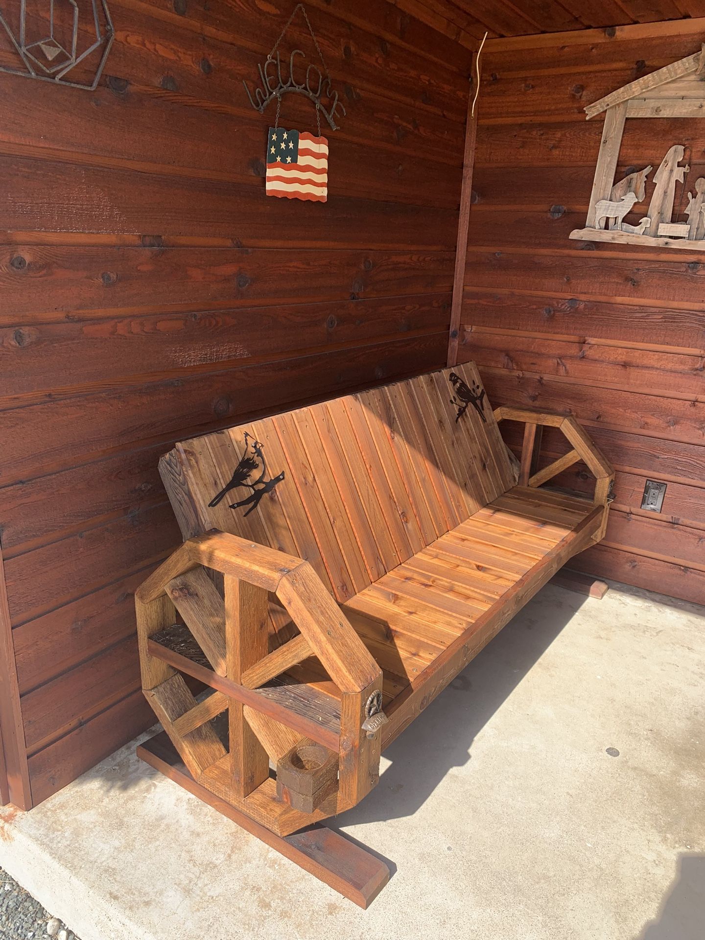 Handmade bench with cup holders and bottle openers on both ends. Fits 3 or 4 people Stain finish Dimensions 6’ x 3’
