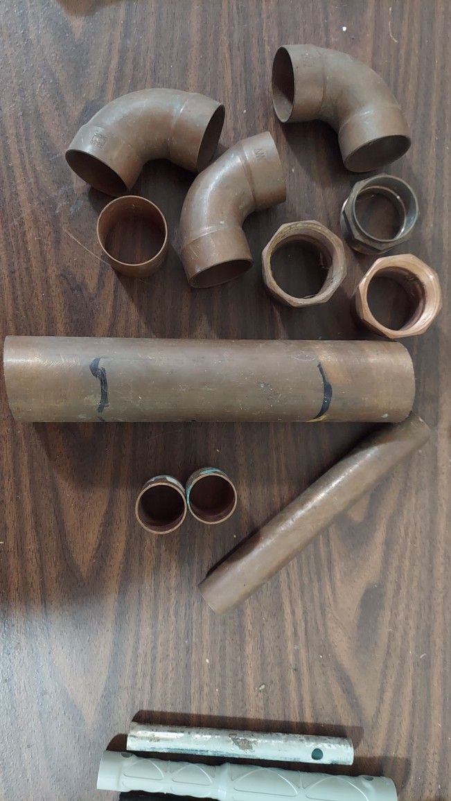 1.5" 3 x 90s and some couplings and threaded fittings 1" copper pipe and 2 couplings 2" copper pipe
