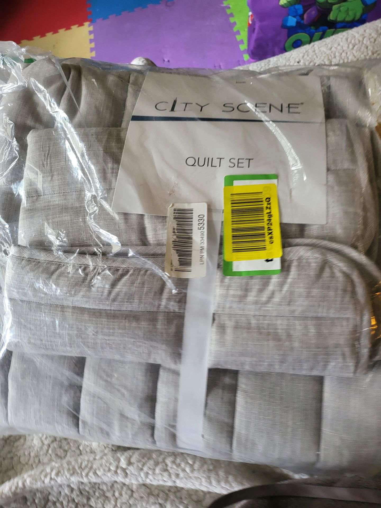 The solid Pascal Quilt Set from City Scene is too stylish to be basic, yet it is sure to become an essential component of your bedroom wardrobe whether used alone or as a layering piece with a duvet or comforter set. The fabric is an all-cotton yarn dye slub weave with a heathered appearance and subtle textural interest. Natural cotton fibers get softer with every wash and offer breathability for year-round comfort. A horizontal channel quilt adds dimension and pattern interest and the thunderstorm grey color is a versatile neutral that brings a calm tranquility to any room. Set is machine washable for easy care. Twin quilt set includes: one quilt (88"L x 68"W) and one sham (21"L x 27"W). New, never used Pick up in North Seattle, Northgate