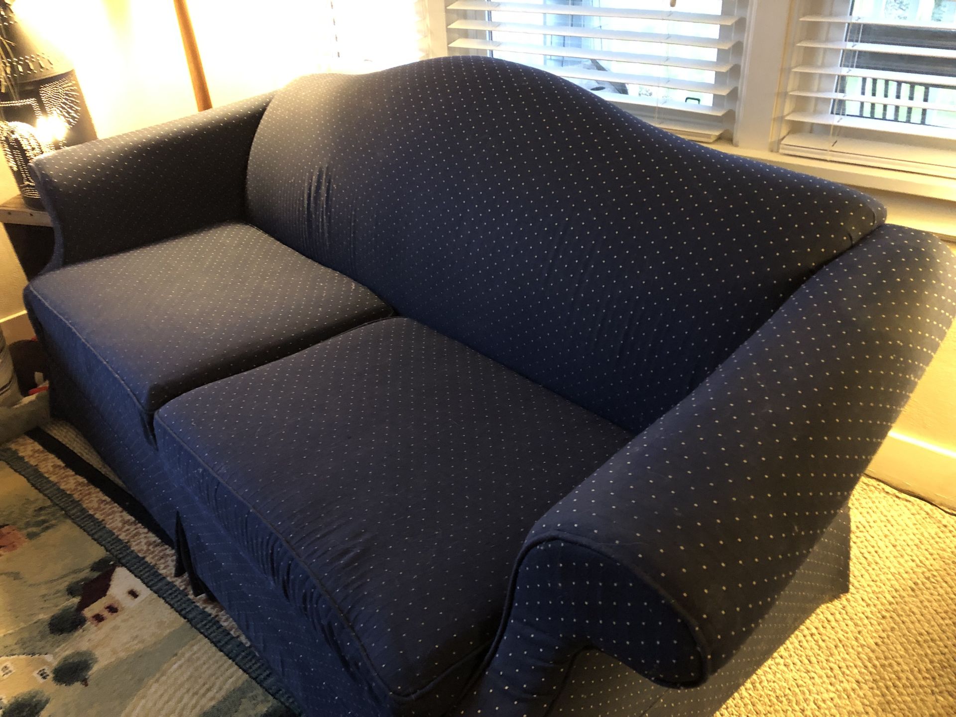 78x35x35. Free couch you haul. Navy blue with white spots.