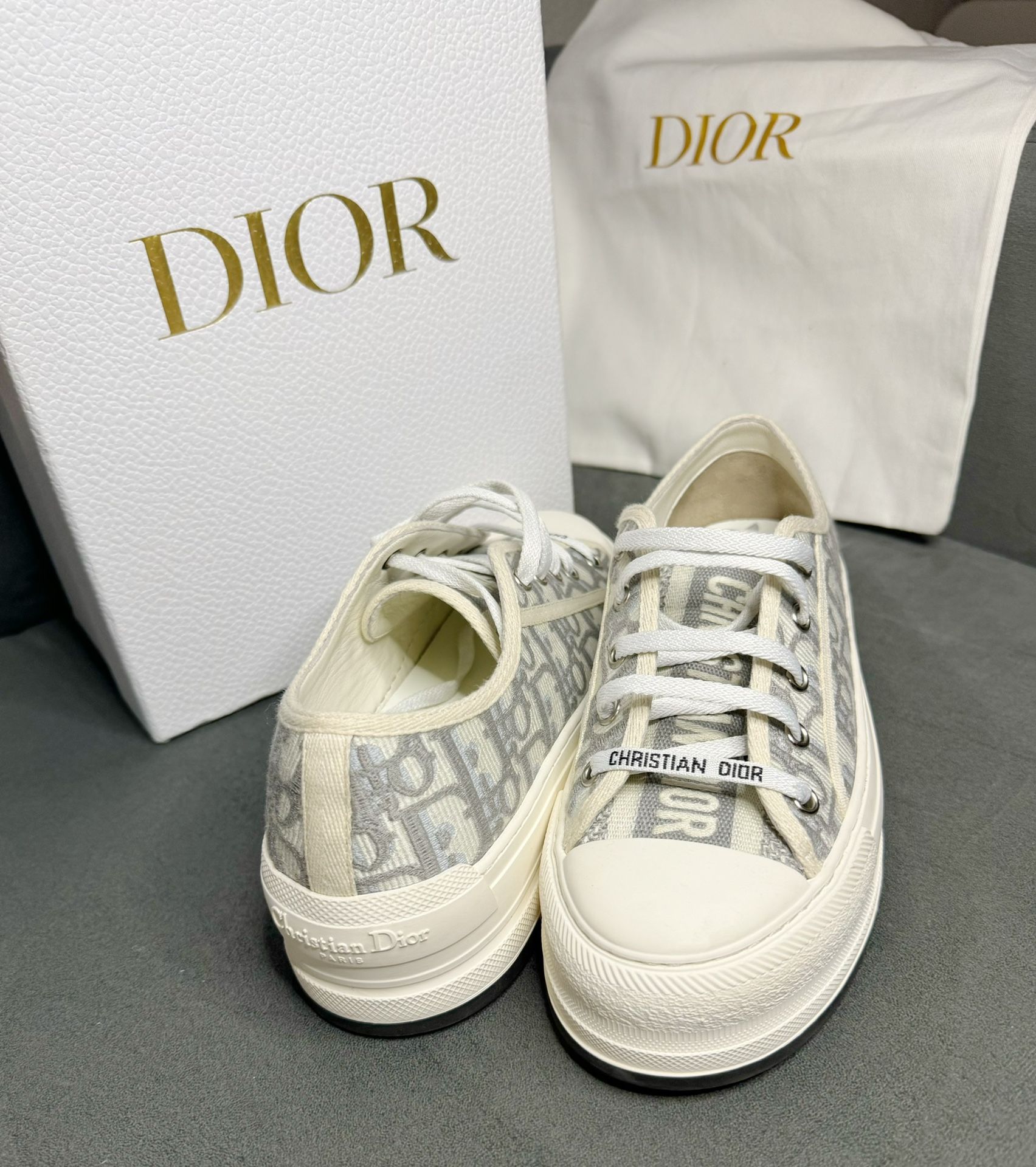 In excellent condition, used only once. Size 6 WMNS selling for a good price with a perfect condition. Original Price $1,090 + CA tax 88.56 Paid $1,178.56 The Walk'n'Dior platform sneaker enhances the line with a modern creation. The upper in stone gray Dior Oblique embroidered cotton reveals a comfortable thick sole, tongue and Christian Dior laces. The sneaker will add a contemporary touch to any laid-back look. Signatures on tongue, sole and laces EVA platform with star, Christian Dior's lucky symbol Made in Italy Additional set of laces provided