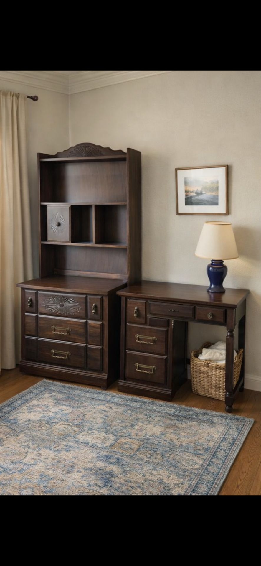 Vintage desk and cabinet with removable shelve on top. Solid and heavy dark wood. Bought for Grandson but did not fit as plan $45 for the set Or $25 desk, $25 cabinet Desk 56L 18D 31H Cabinet 32L 18D 31H Removable shelve 31L 9D 46H Cash and carry