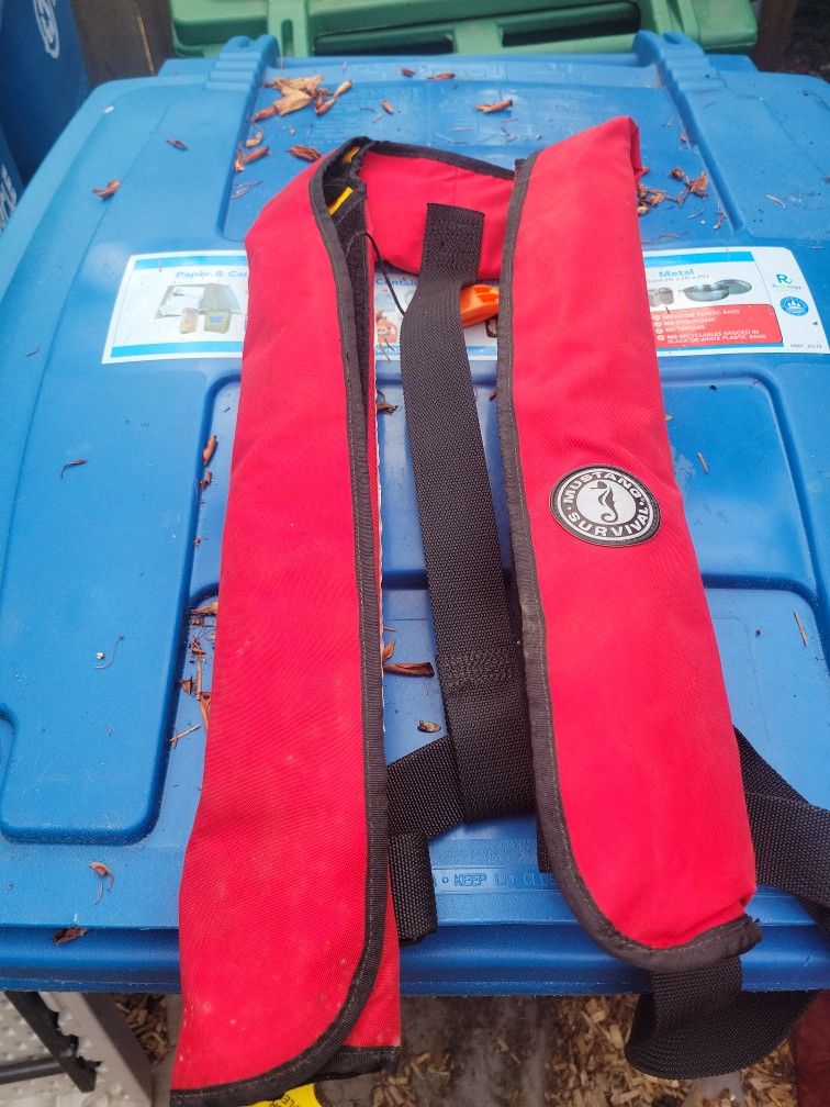 "Mustang Survival" inflatable life vest. Like new. With gas cartridge. Amazon sells for $140 without gas cartridge.