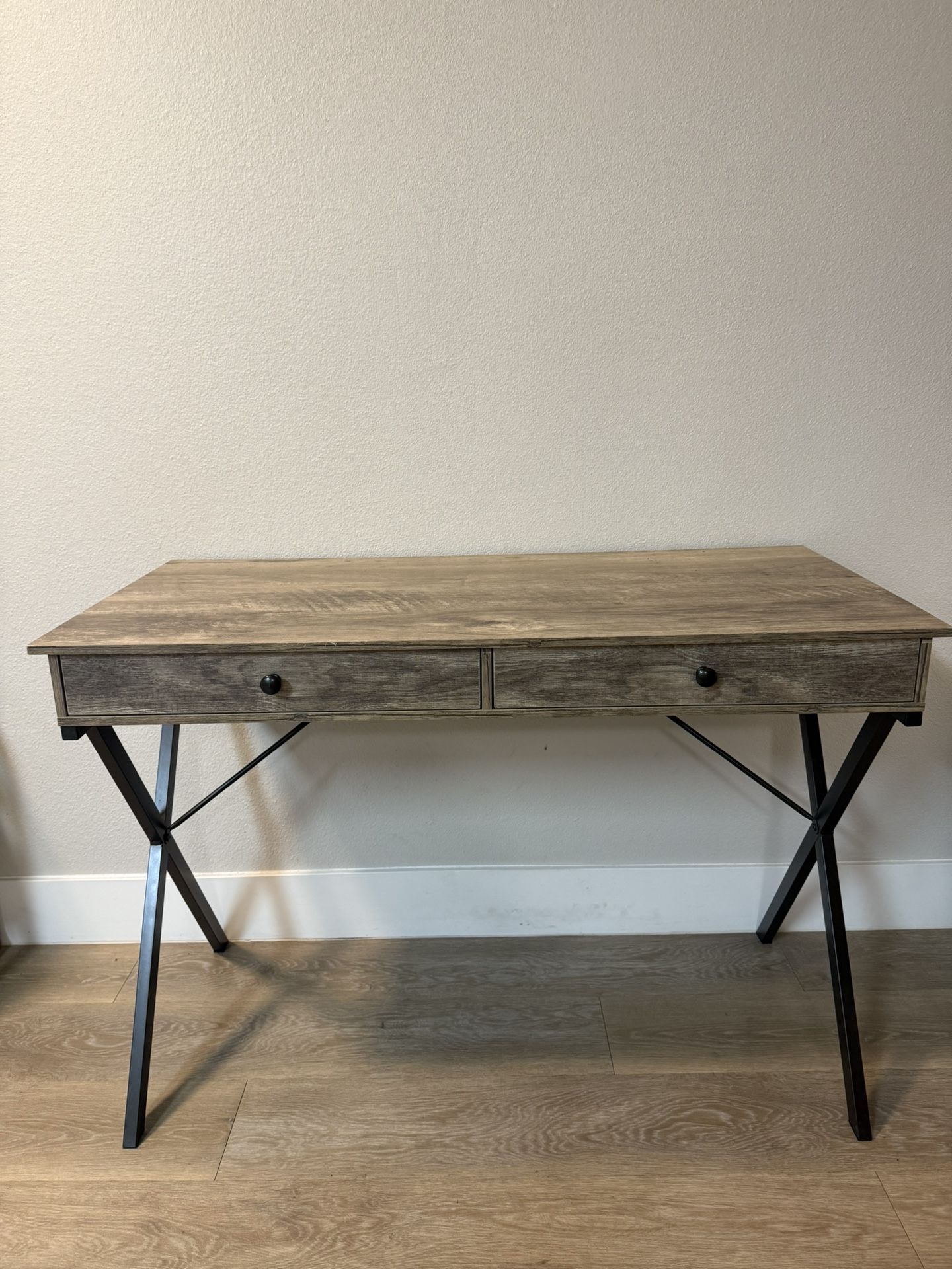 Minimalist two-drawer desk with a woodgrain finish and sturdy black metal legs. Sleek and functional—perfect for a home office, studio, or creative workspace. • Compact yet spacious • Smooth sliding drawers • Neutral tones to match any décor • Gently used, excellent condition Pickup in Los Angeles.