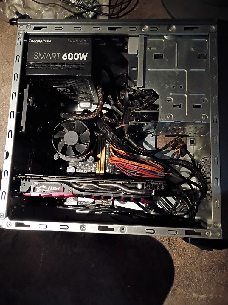 Asus m32 series desktop. I5 processor, thermal lake 600w smart power supply . Msi gforce gtx 1070 gaming x 8G ,(new old stock ) GPU. DVD burner . 650gig hard drive ,windows 10pro. 16 gigs of ddr3 ram installed .