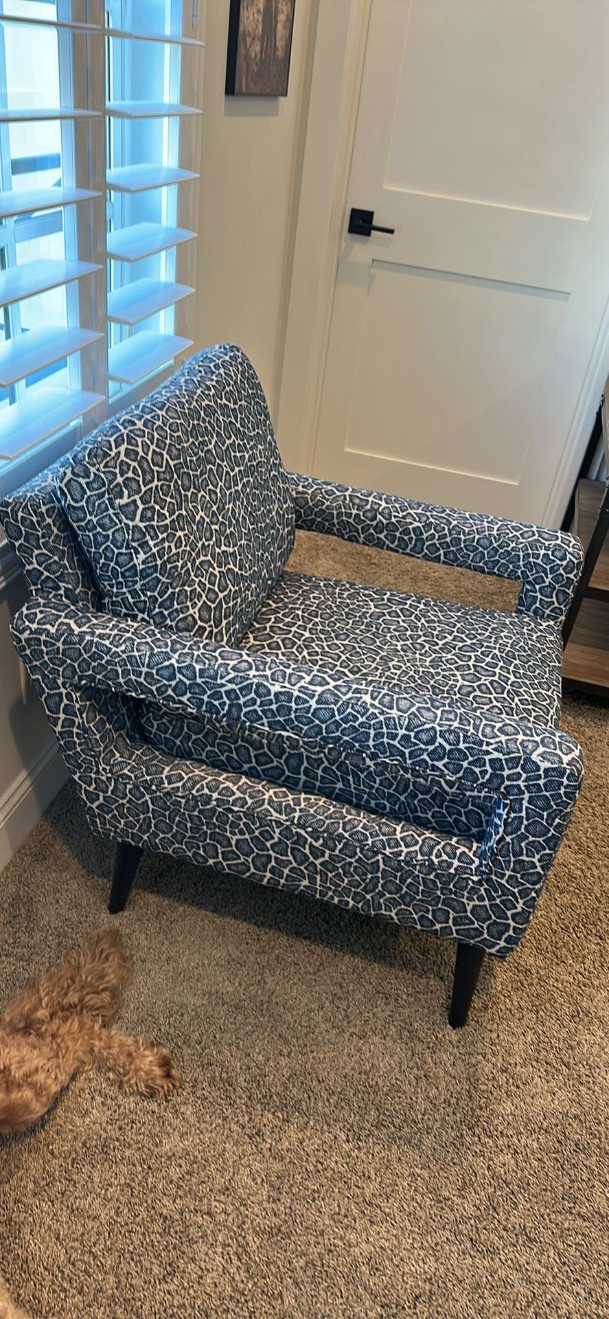 Decorative arm chair or club chair. Blue and white in an animal print. Excellent condition. Purchased it for a guest house and then the guest house ended up not being used. $60 OBO.