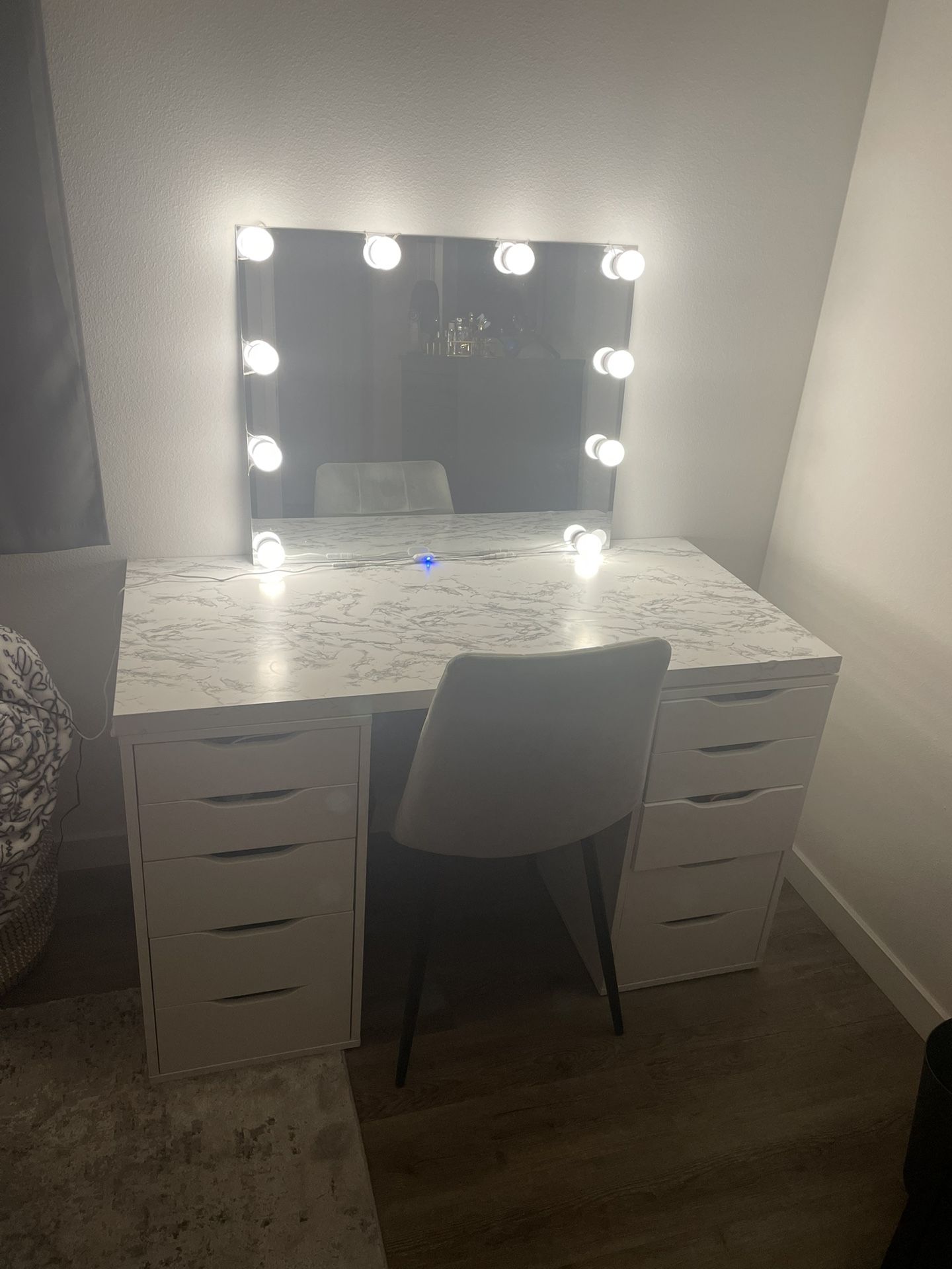 2 IKEA Alex drawers in white 1 Linnmon table top that has removable marble design Mirror with LED lights that plugs into the wall- one light bulb needs another sticky adhesive Gray chair that fits perfect under the vanity Everything is is good condition Drawers have some scuff marks due to moving a few times No missing pieces