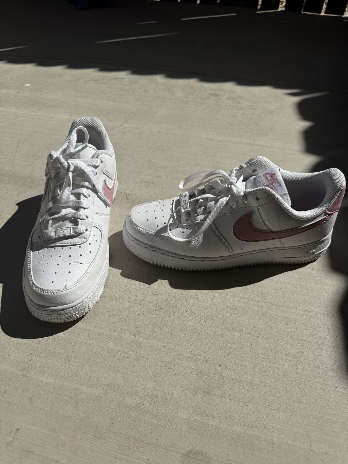 Nike Air Force 1 Low sneakers, white with pink swoosh. Women’s size 8.5. In good condition.