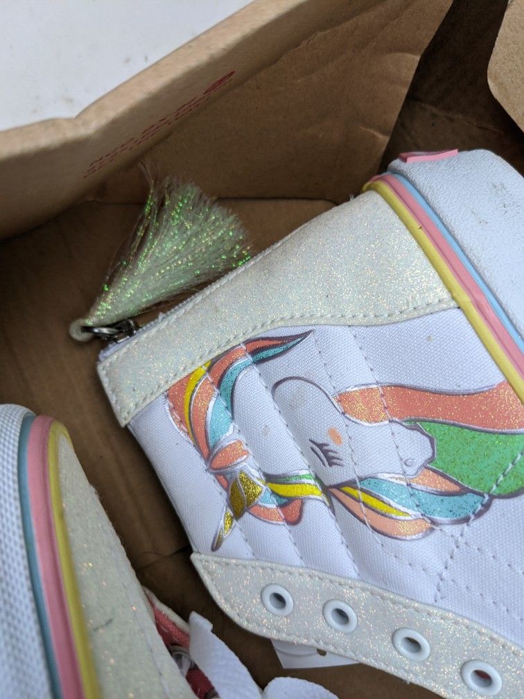 Brand new unicorn vans size 4 with zipper on heel. Box is damage but never have been worn. Clean pair of vans