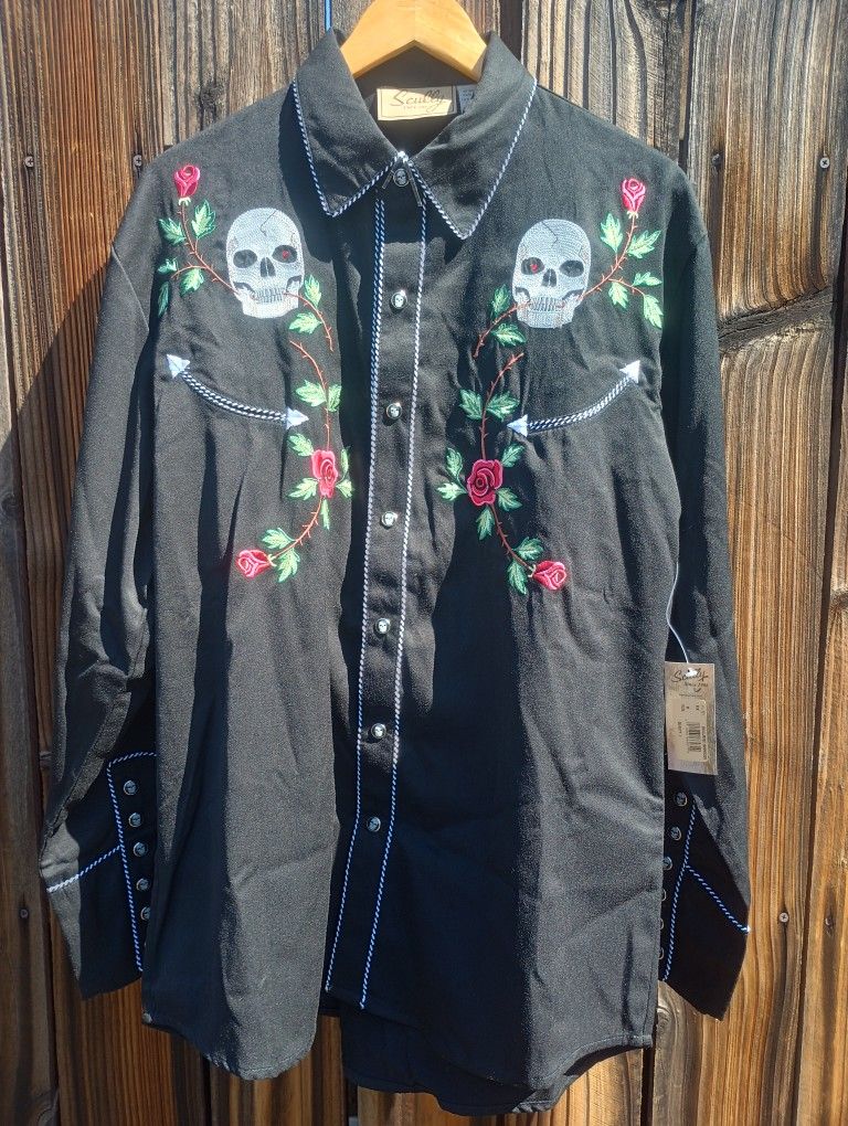 Scully Western Shirt Men Medium Skull & Roses Embroidered Shirt Black W/Pearl Snaps
