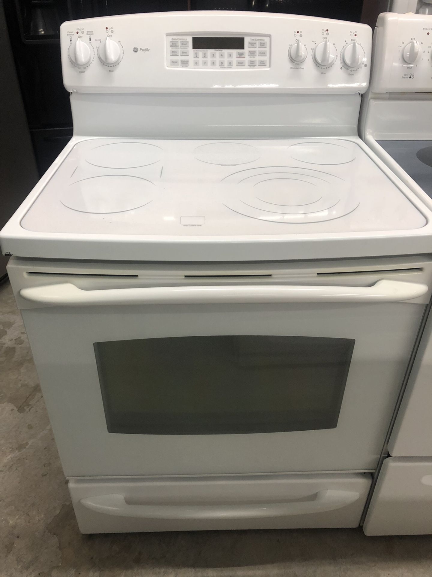 GE Profile all white 5 burner convection stove. Top has 1 extra large expandable burner a griddle burner 2 small burners and 5th warming burner. Easy to use digital clock with auto recipe conversion for conversation and custom broil. Large oven with light and window in the door. Comes with 120 day warranty. Financing and delivery available.