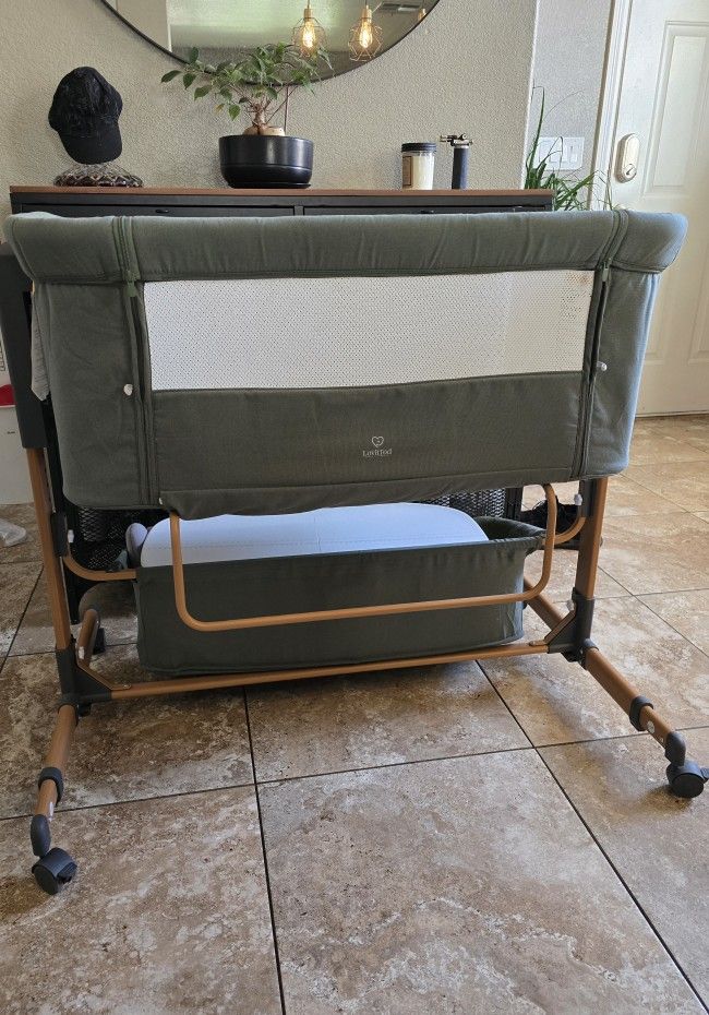 I loved this item so much, I bought one for each floor of the house. Available in Green and Dark Charcoal. Perfect as a bedside or a standalone bassinet. Ample storage for diapers, clothing, etc. Adjustable on both sides and can be tilted for babies with reflux (pictured). Sturdy with breathable mesh. Bassinet can be used for rocking and has 6 adjustable heights.