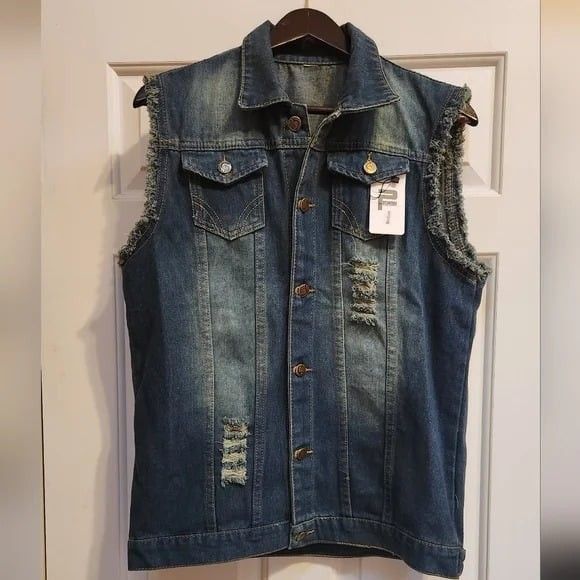 Men's Sleeveless Denim Vest - NWT! Casual Slim Fit Rip Classic Button Down Distressed/rugged Made of 80% Cotton fabric that stretches with you/ soft and comfortable Medium New/Never Worn! Stylish and great for layering Pick up near Western and Armitage