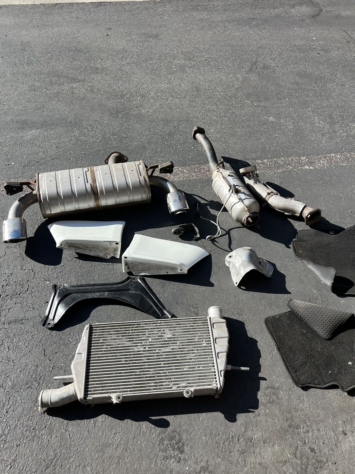 Cleaning out my garage and no longer have the Mitsubishi Lancer Evo X. Every price is negotiable. Only have what’s below: - OEM intercooler:$100 - OEM Muffler: $100 - OEM Cat w/ o2 sensor: $400 - OEM Down Pipe: $50 - OEM Rear Spats: **SOLD** - floor mats: **Sold**