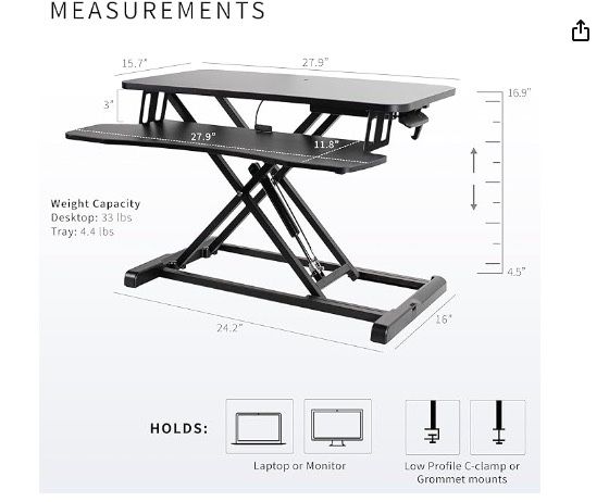 About this item • Create Instant Active Standing - VIVO’s desk riser provides on-demand standing throughout the day for the freedom to get out of your chair and relieve muscle tension, reduce stress, and increase productivity. --Patented-- • Space Efficient 28" Surface - The top surface measures 27.9” x 15.7”, which will easily fit in your workspace. The 27.9” x 11.8” (11” in center) keyboard tray raises in sync with the top surface to create a comfortable workstation. • Strong 33 lbs Lift Assist - Go from sitting to standing in one smooth motion using the innovative simple touch height locking mechanism (Adjustment Range: 4.5” to 16.9”). Lift design elevates straight upwards. • Very Minimal Assembly - This riser is almost ready to go right out of the box! Place on your existing desk, attach the keyboard tray, and start organizing your workstation.