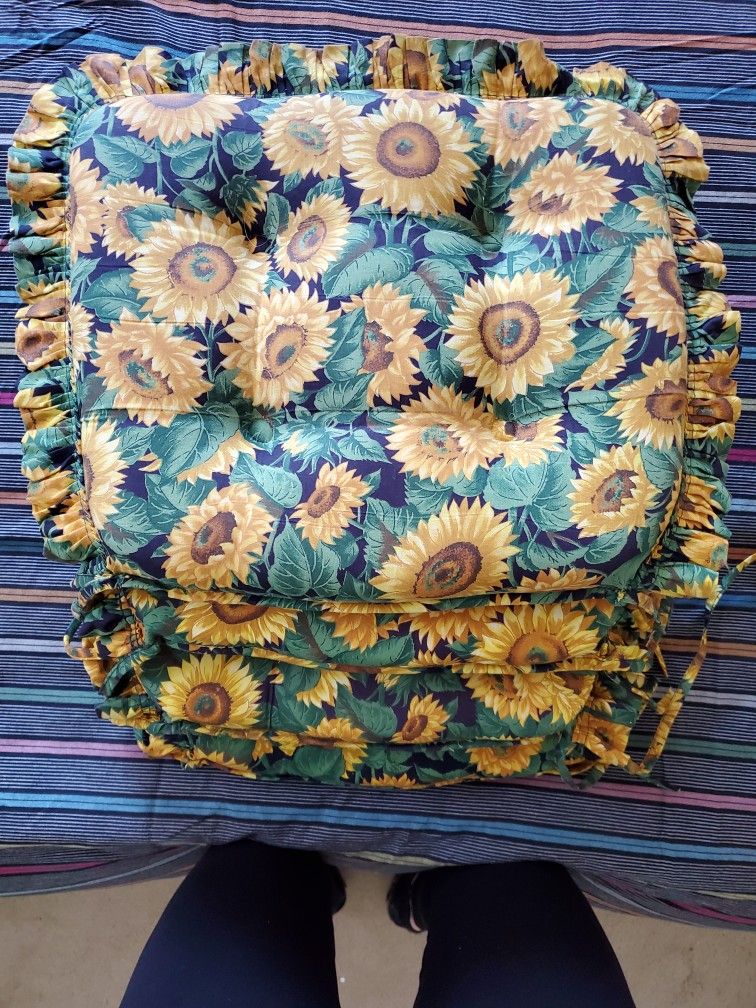 Never used two sunflower (kitchen) chair seat cushions, appr.15.4" x 13.4". Two used only occasionally.