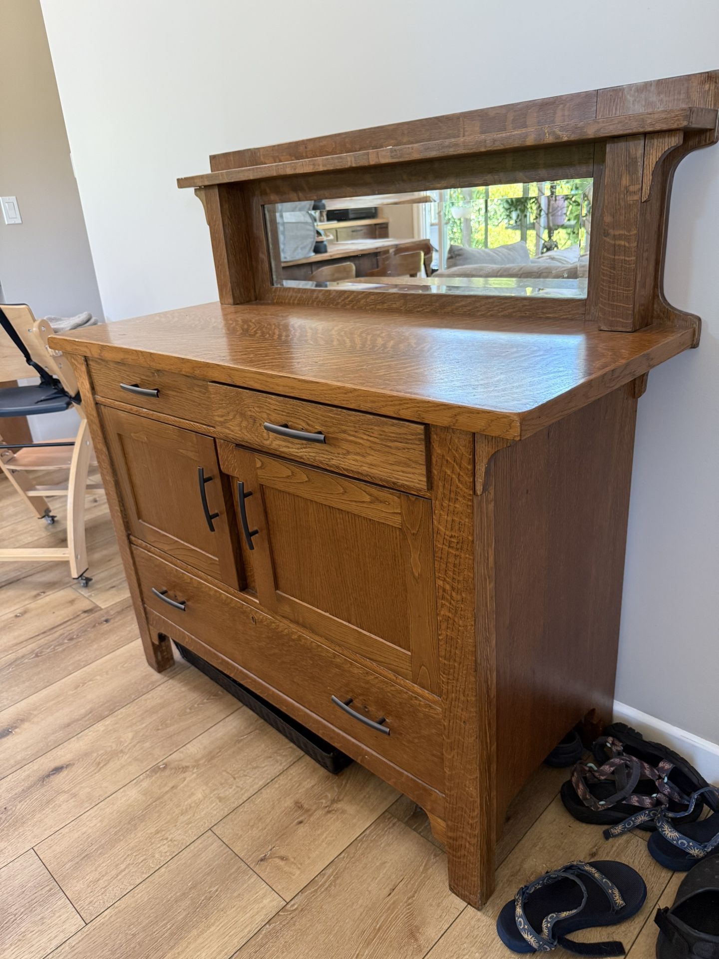 Vintage hardwood vanity with mirror and black hardware Measurements: 35” tall from table top (49” w/ mirror) 48” long 21” deep 18x21” drawers (x2) 36.5x21” drawer 13x48” cubby Used condition $100 OBO Pick up only
