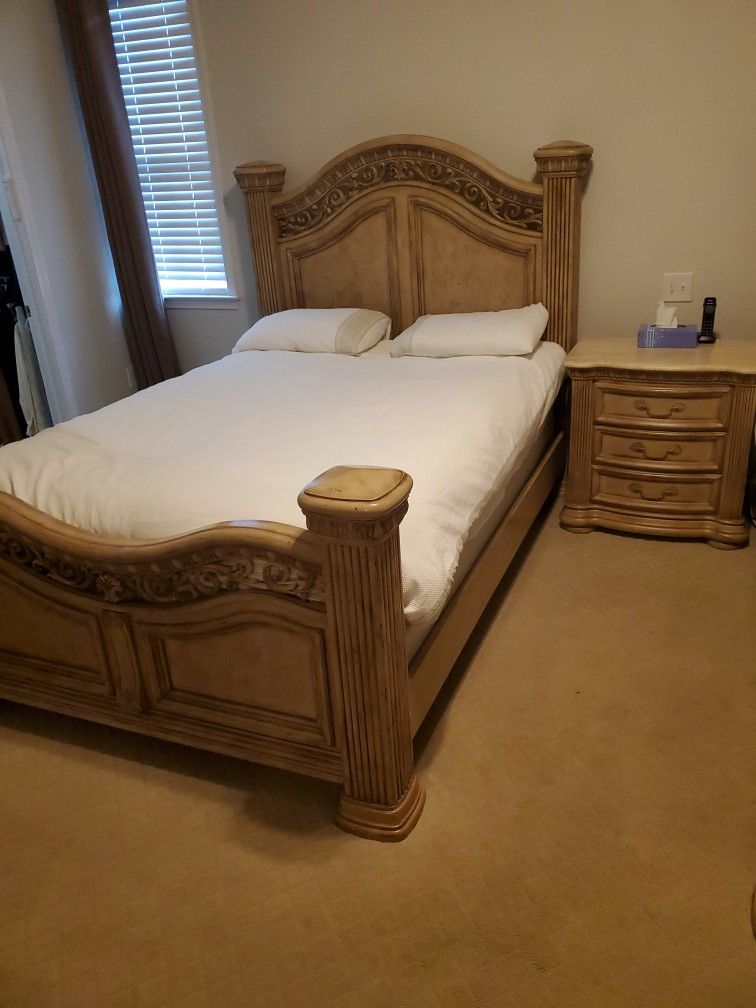 2 Queen size headboard/footboards & bed rails (Box spring & mattress not included) Nightstand Armoire Dresser & Mirror Excellent condition Queen Mansion Bed : W66.5" x D101" x H65.5" Door Dresser : W68.5" x D22.5" x H41" Landscape Mirror : W48" x D5" x H49.25" Entertainment Armoire : W47.75" x D22.5" x H78.25" Night Stand w/ Marble Top : W33.25" x D21.25" x H34"