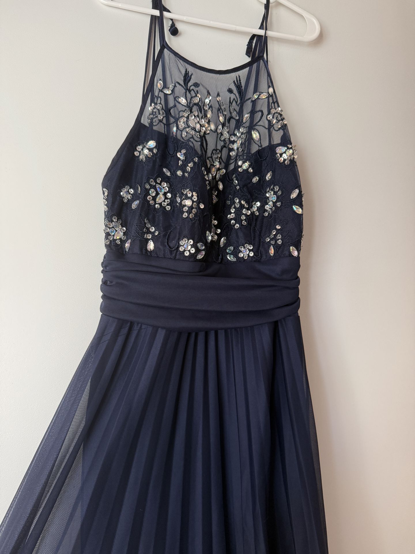 B. Darlin navy blue prom dress with beaded floral details and adjustable straps. Has built in bra padding. Size 3 Length: 53 inches