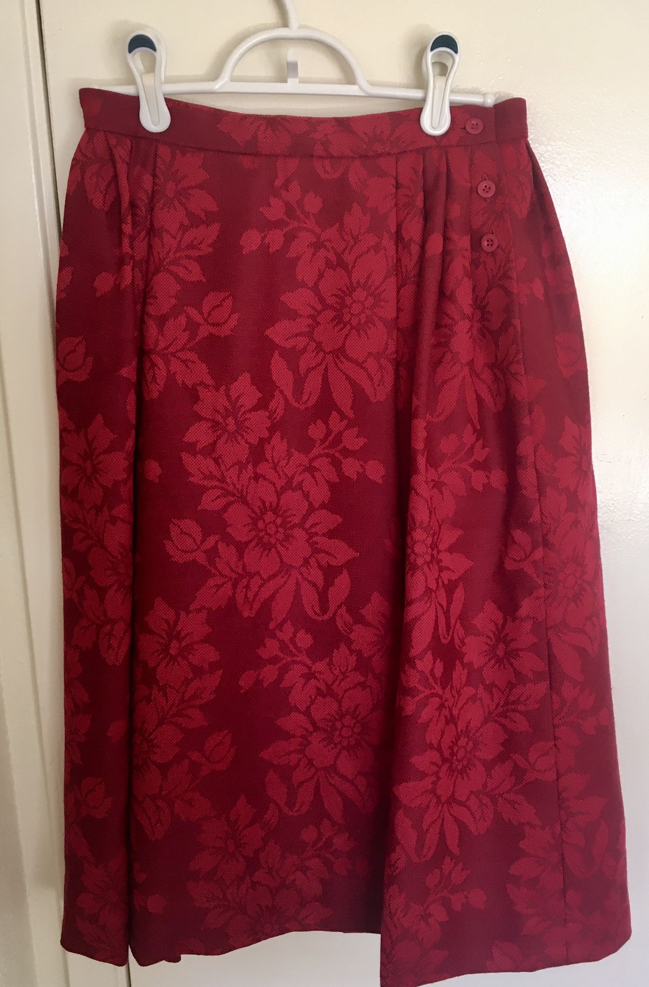 This is a vintage Jaeger skirt made of %100 wool. The lining is %100 Triacetate and it is A-line style, red, with a rose pattern. The right side zips and buttons up (high waist) and there are two deep pockets on either side. It is dry clean only and was recently dry cleaned and hasn’t been worn since. The tag says “size 10,” but being that it’s British made, it is 25 inch waist and 36 inch hips (US size). It is perfect for the office or conferences. Let me know if you’re interested.